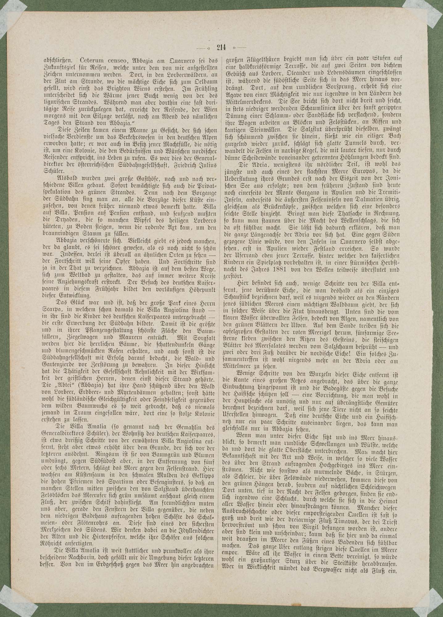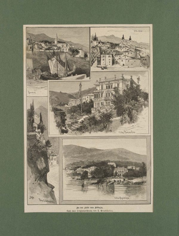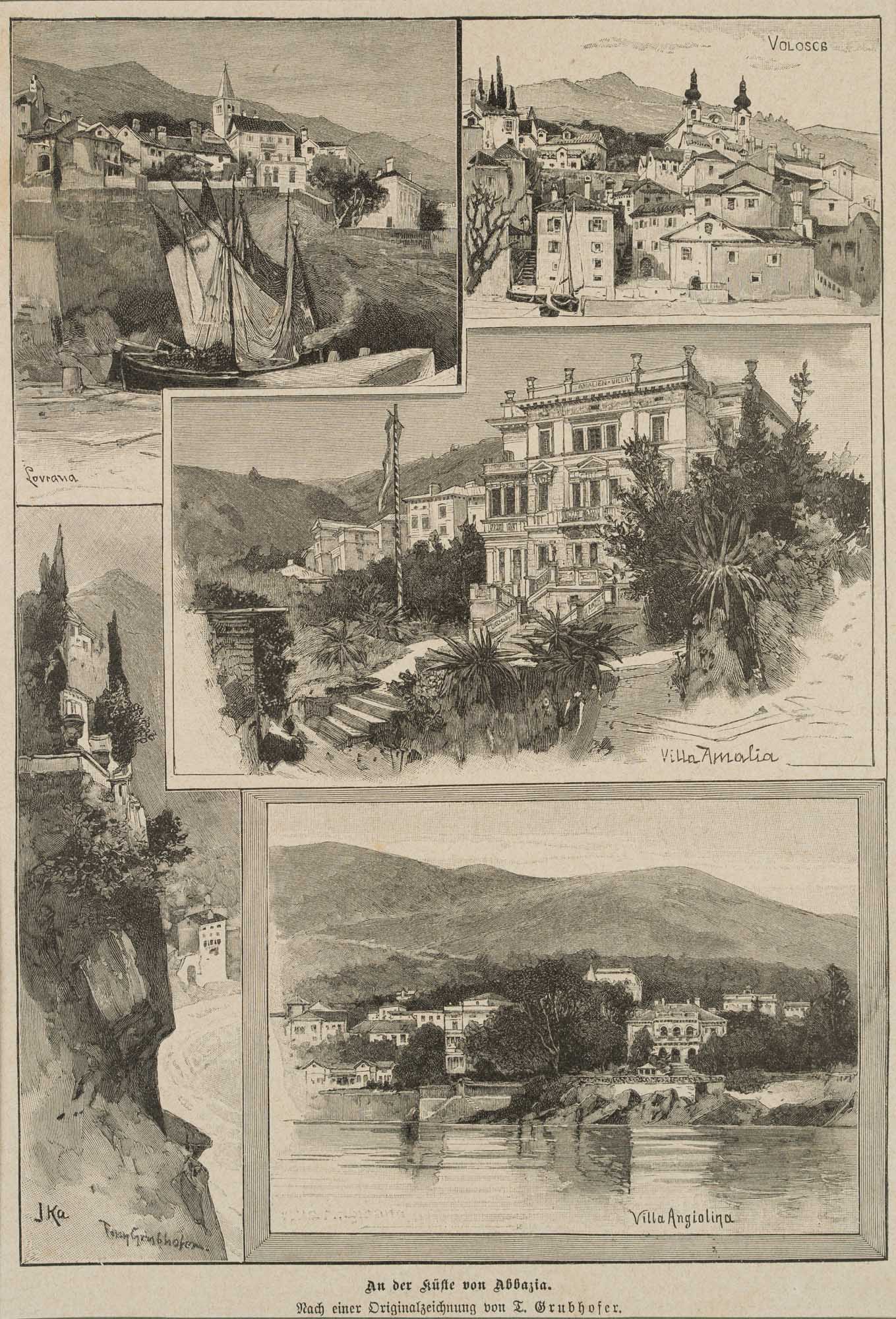 - Beschreibung: Die Darstellung zeigt unter anderem Ansichten von Lorrana, Volosce und Villa Angiolina. Unter der Darstellung betitelt und bezeichnet “Nach einer Originalzeichnung von T. Brubhofer”. Abbazia ist ein Seebad auf der Halbsinsel Istrien im Nordwesten Kroatiens, einst mondäner Winterkurort der Donaumonarchie.