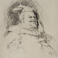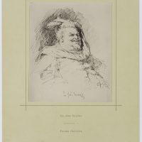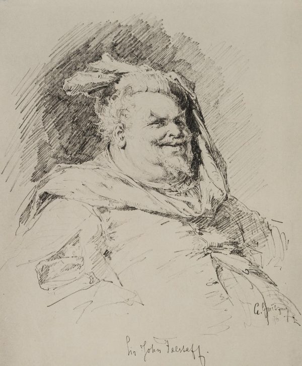 Die Darstellung zeigt die literarische Figur des Sir John Falstaff, die erstmals in den Stücken “Heinrich IV” und “Die lustigen Weiber von Windsor” von William Shakespeare vorkam. Die Figur des wohlbeleibten sowie trink- und raufsüchtigen Soldaten war sehr beliebt und wurde auch von anderen Autoren und Komponisten aufgegriffen und als komische Figur verarbeitet. - Datierung: 1876