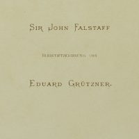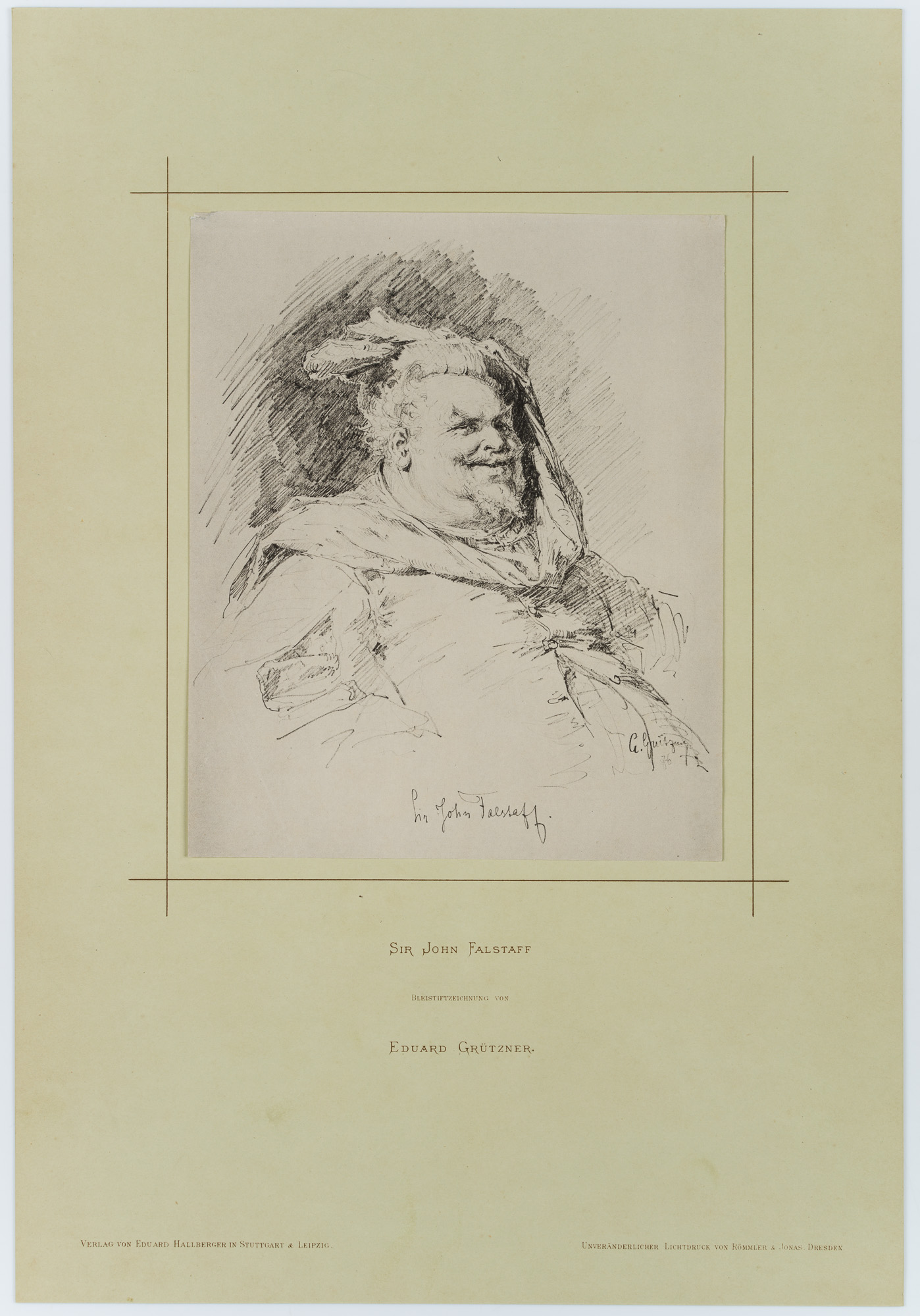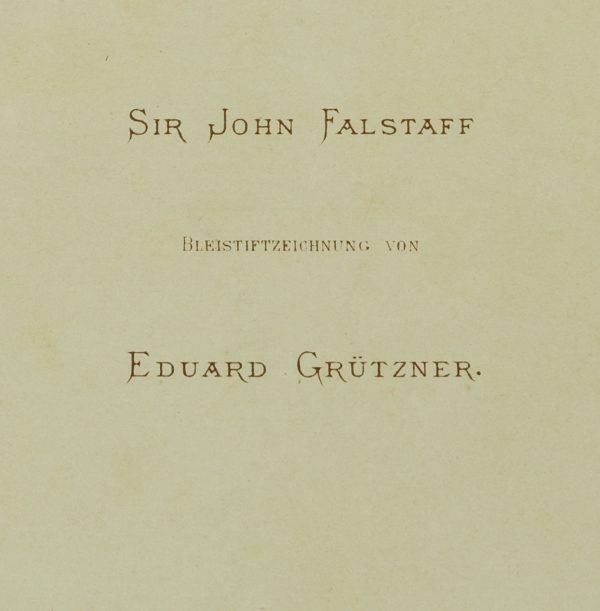 - Bezeichnung: Rechts unten in der Darstellung signiert und datiert “76”. Mittig unterhalb der Darstellung betitelt; auf dem Trägerkarton betitelt und bezeichnet “Bleistiftzeichnung von Eduard Grützner / Verlag von Eduard Hallberger in Stuttgart & Leipzig. / Unveränderlicher Lichtdruck von Römmler & Jonas, Dresden”.