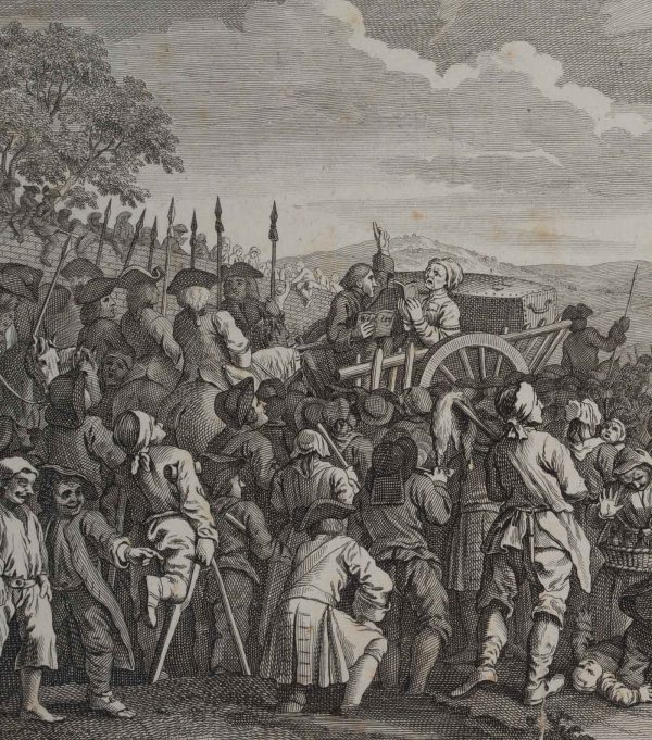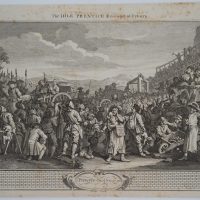- Description: Inscribed lower left “W. Hogarth inv. Pinx.”, inscribed lower right “R.D.U.sc.”. Depiction after the eleventh sheet from the series “Diligence and Sloth” by the British painter and engraver William HOGARTH from 1747, named “The Idle ‘Prentice executed at Tyburn”. On the left edge of the picture a procession of soldiers on foot and horseback can be seen accompanying a wooden carriage. On it sits a preacher with a book, called “Wesley”, next to Thomas Idle, protagonist of the series, who is here leaning against his own coffin. Numerous onlookers have gathered in the large square to watch the marvellous spectacle.