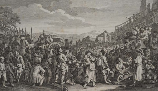 - Beschreibung: Bezeichnet unten links “W. Hogarth inv. Pinx.”, bezeichnet unten rechts “R.D.U.sc.”. Darstellung nach dem elften Blatt aus der Serie “Fleiß und Faulheit” des britischen Malers und Kupferstechers William HOGARTH von 1747, benannt “The Idle ‘Prentice executed at Tyburn”. Am linken Bildrand ist eine Prozession von Soldaten zu Fuß und Pferd zu erkennen, die eine hölzernes Fuhrwerk begleiten. Auf diesem sitzt ein Prediger mit einem Buch, genannt “Wesley”, daneben Thomas Idle, Protagonist der Serie, der sich hier gegen seinen eigenen Sarg lehnt. Zahlreiche Schaulustige haben sich auf dem großen Platz eingefunden um das markbarere Schauspiel zu beobachten.