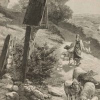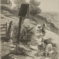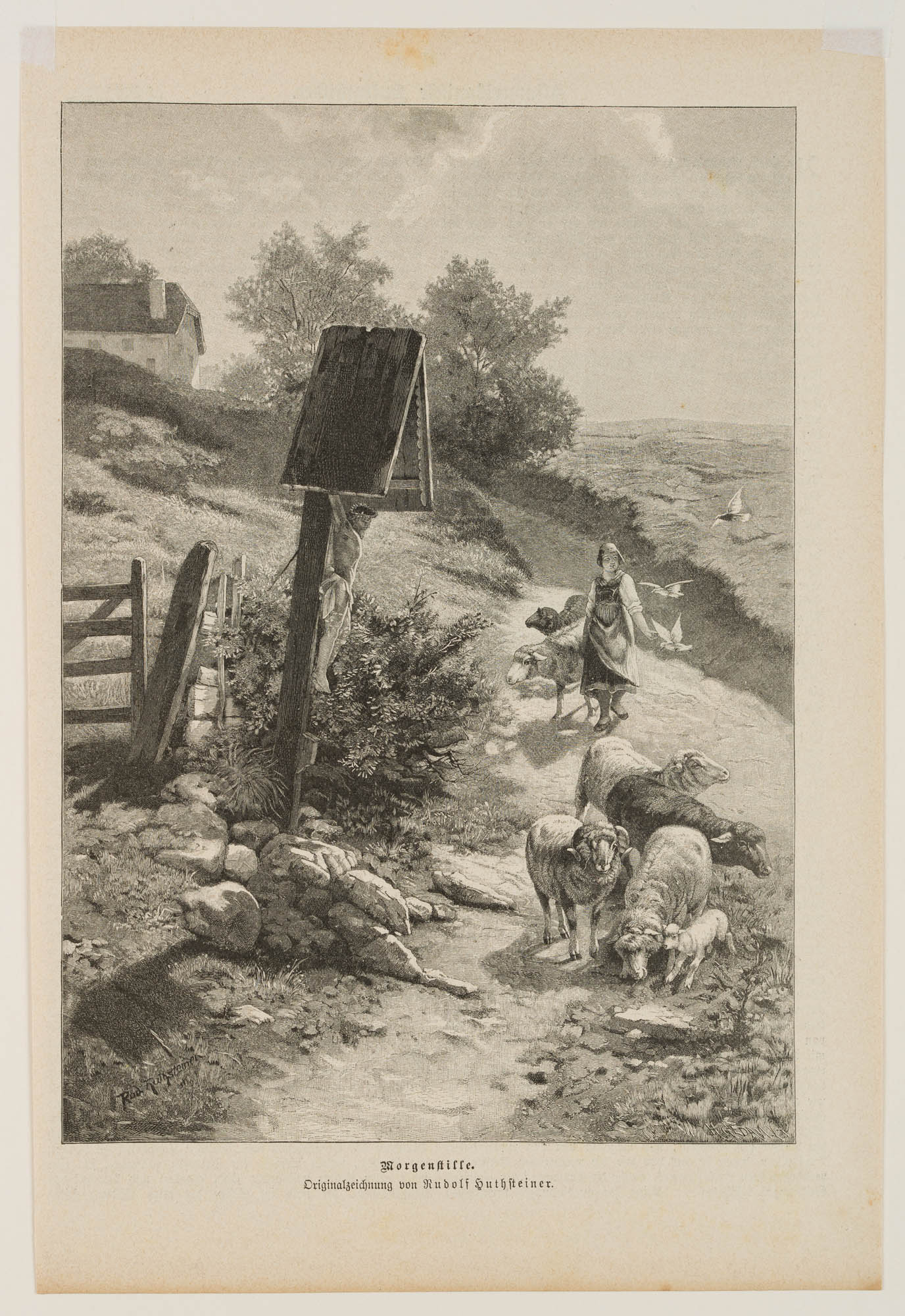 Nach Rudolf Huthsteiner (1855 Düsseldorf – 1925 ), Morgenstille. Ziegenhirtin an einem Wegeskreuz vorbeilaufend, 19. Jahrhundert, Holzstich