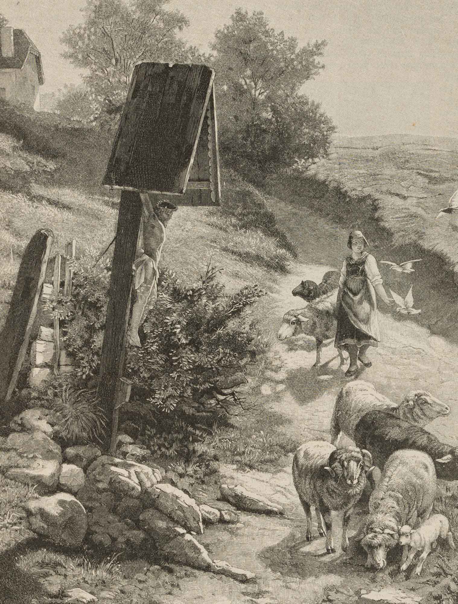 After Rudolf Huthsteiner (1855 Düsseldorf – 1925 ), Morning silence Goatherd walking past a wayside cross, 19th century, Wood engraving