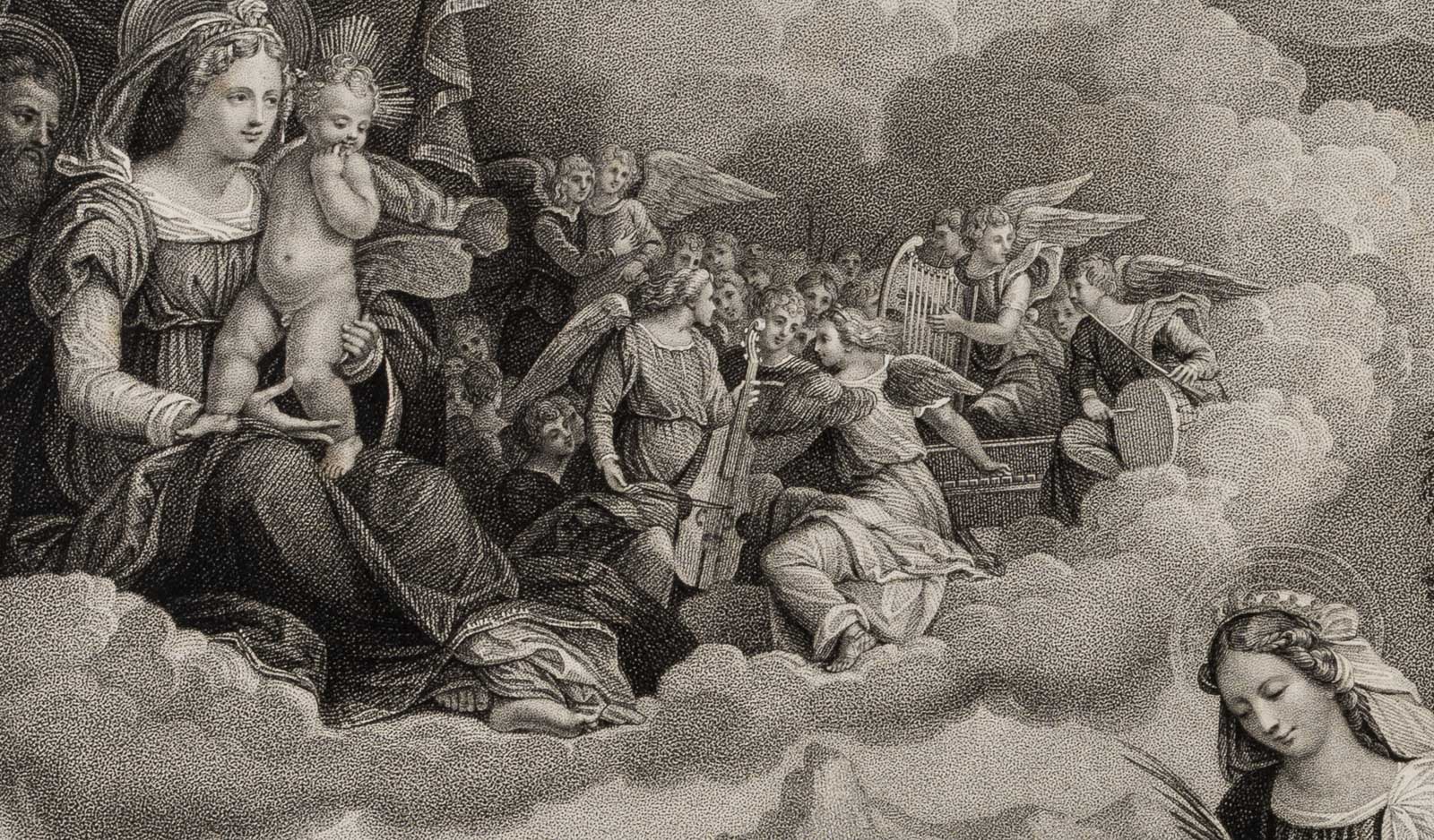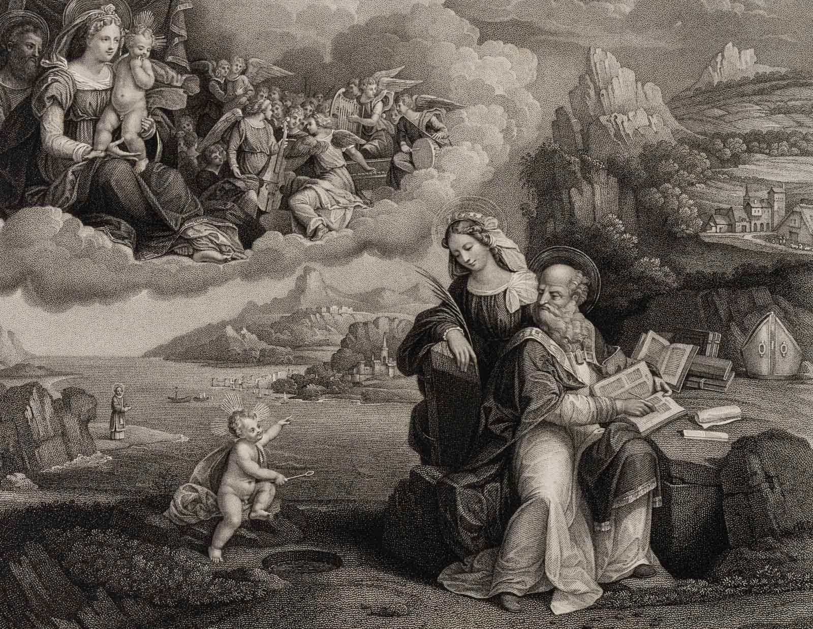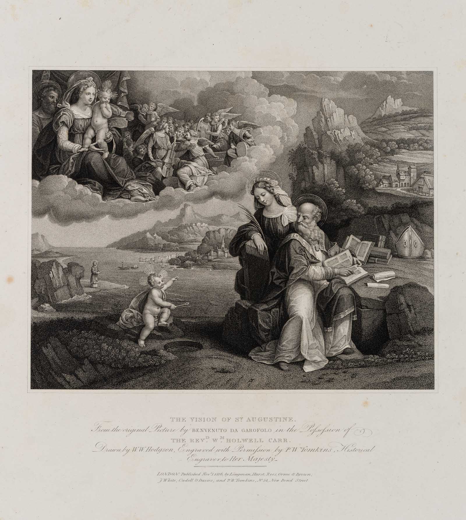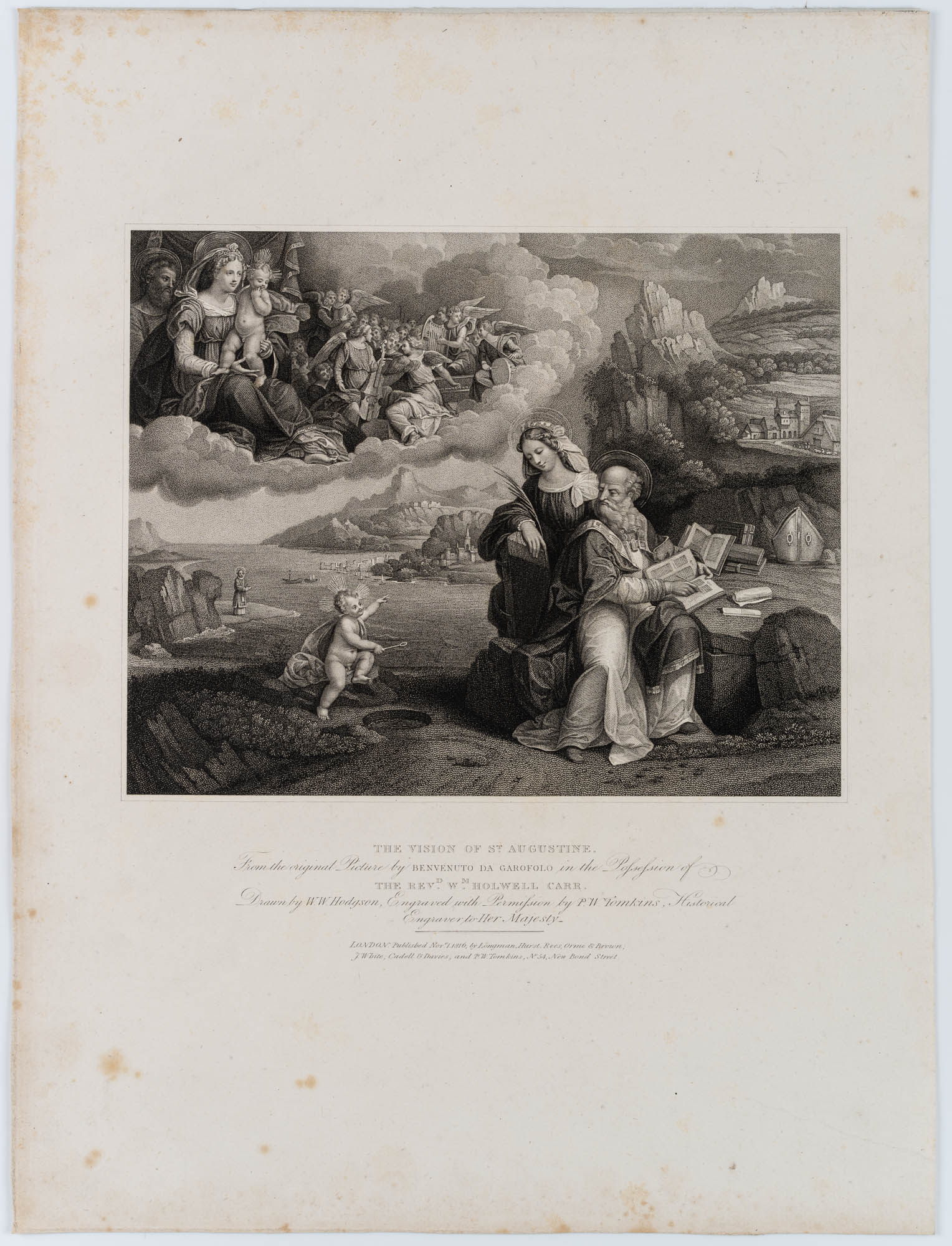 - Description: The depiction shows “The Vision of St Augustine”, after Garofalo, Benvenuto Tisi da (1481-1559) painted around 1520. In the right foreground St Augustine is seen with St Catherine in a landscape, writing in a book. In the upper left corner are the Holy Family and angels playing music.Entitled and inscribed “From the original Picture by Benvenuto da Garofolo, in the Possession of / the Rev.d W.m Holwell Carr / Drawn by W W Hodgson, Engraved with permission by P. W. Tomkins, Historical / Engraver to Her Majesty’, and ‘London, Published Nov.r 1 1816, by Longman, Hurst, Rees, Orme & Brown / J. White, Cadell & Davies, and P.W. Tomkins, 54 New Bond Street’.