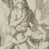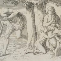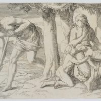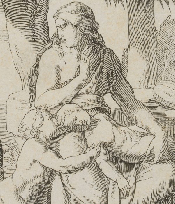 After Gustav Jäger (1808 Leipzig – 1871 ibid.), Adam digs with the pick stick while Eve gives Cain and Abel the breast, 19th century, Etching