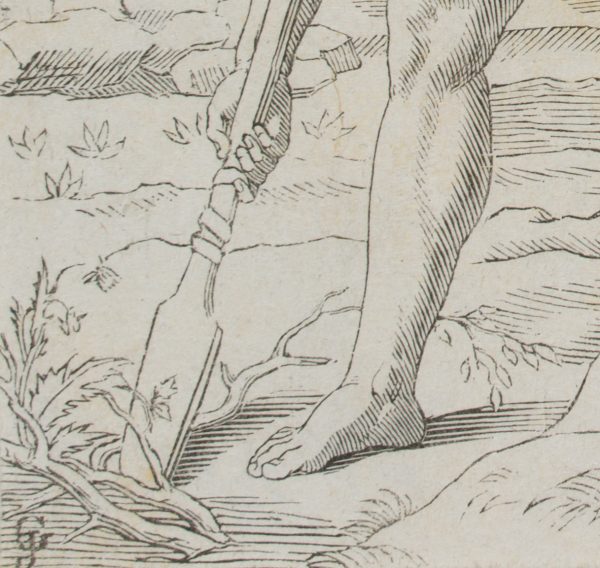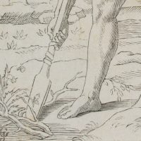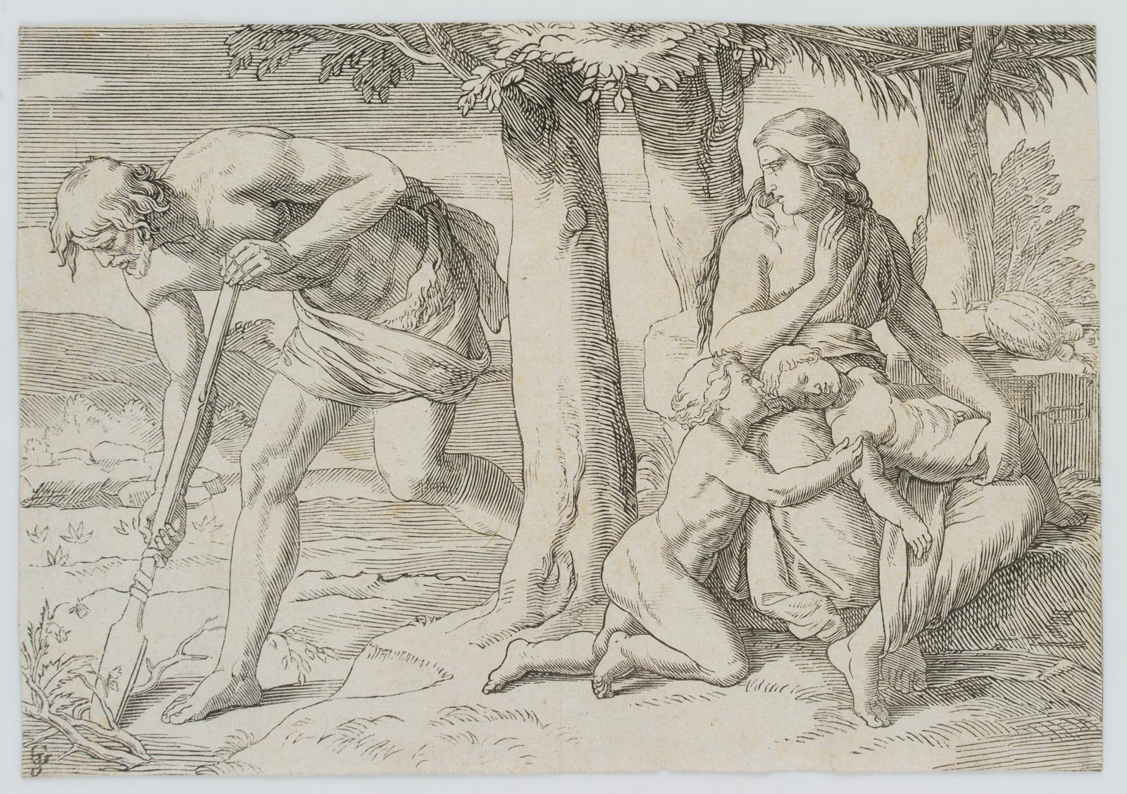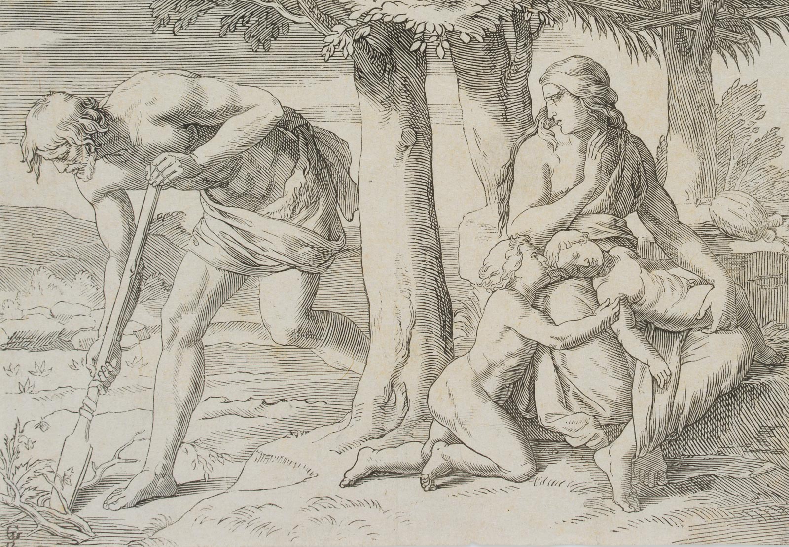Nach Gustav Jäger (1808 Leipzig – 1871 ebd.), Adam gräbt mit dem Hackstock, während Eva Kain und Abel die Brust gibt, 19. Jahrhundert, Radierung