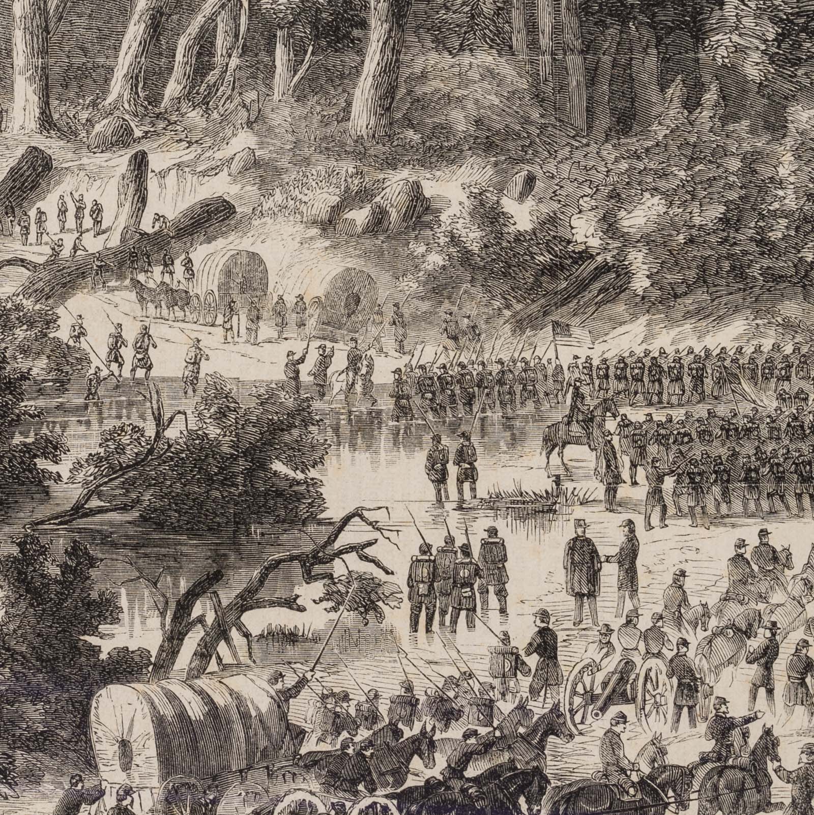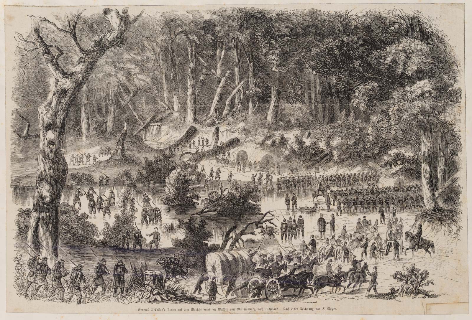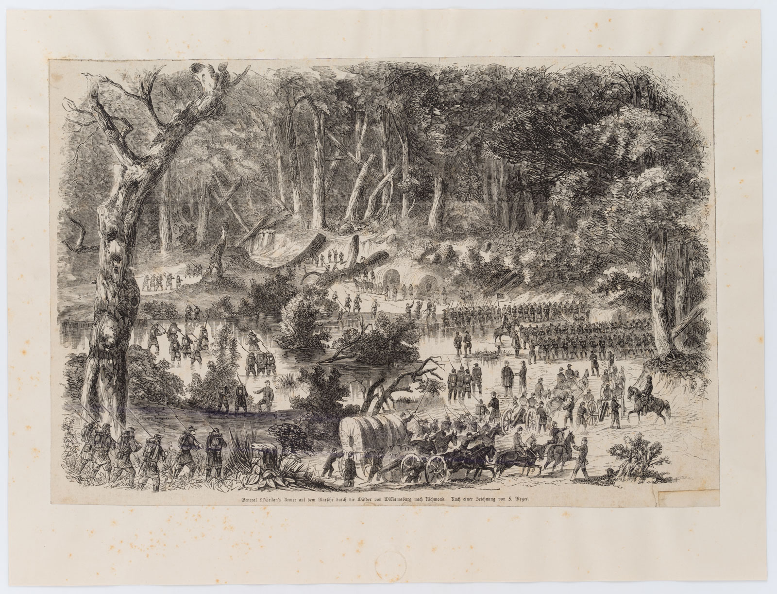After F Meyer (19th century), General McClellan’s Army on the March through the Woods from Williamsburg to Richmond, 19th century, Wood engraving