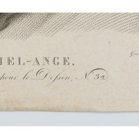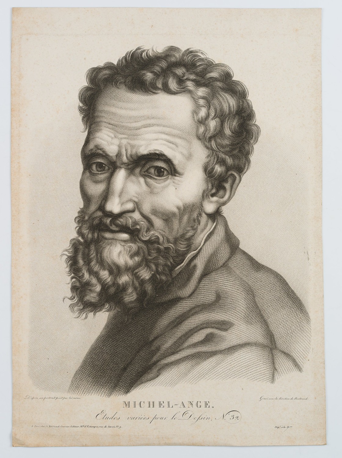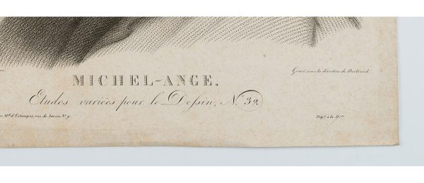 - Bezeichnung: Unterhalb der Darstellung mit dem Namen des Dargestellten beschriftet: “Michel-Ange. Etudes varieés pour le Dessin N. 32”, links und rechts in der Druckplatte signiert, unten links am Rand in der Druckplatte die Adresse der Druckerei: “A Paris chez N. Bertrand, Graveur, Editeur, Md. D’Estampes, rue de Savoie N. 9”