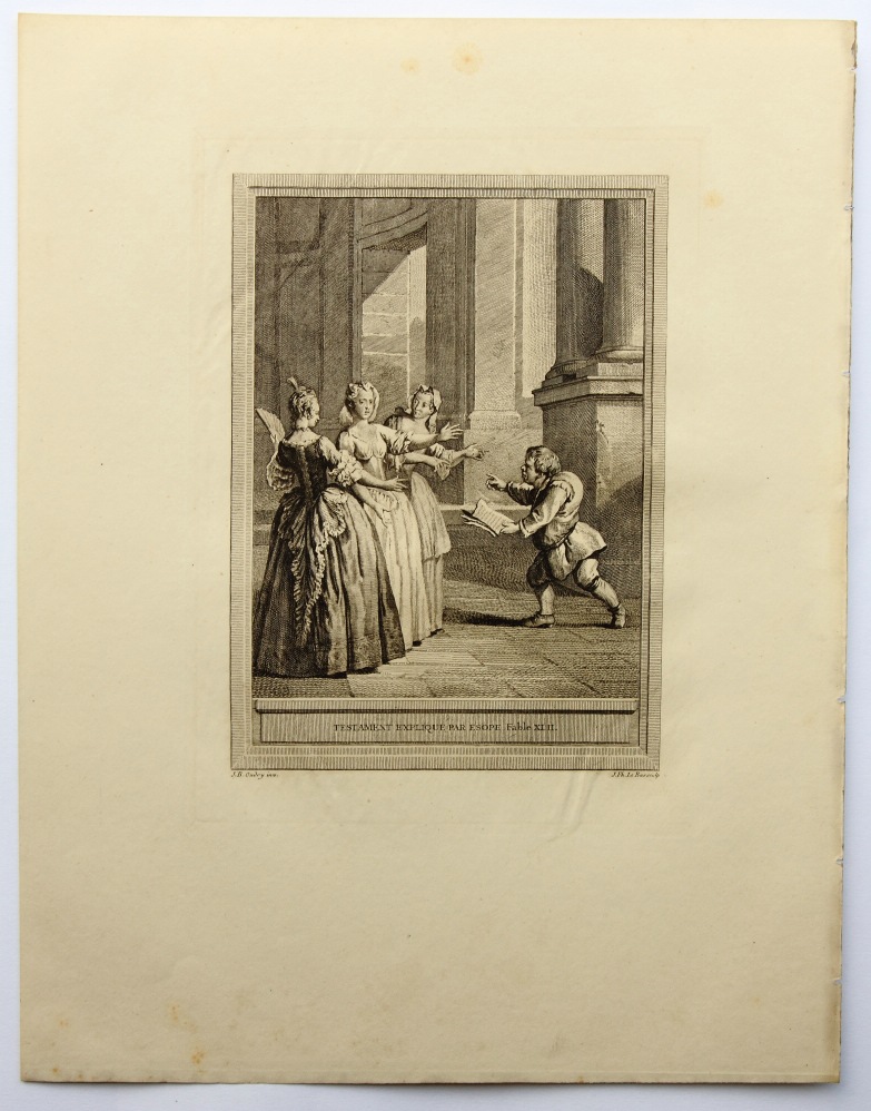 - Beschreibung: Illustration einer Fabel. Nach einer Vorlage von Jean-Baptiste Oudry (1686 Paris – 1755 Beauvais). In Darstellung französischsprachig betitelt und darunter in Druckplatte signiert.