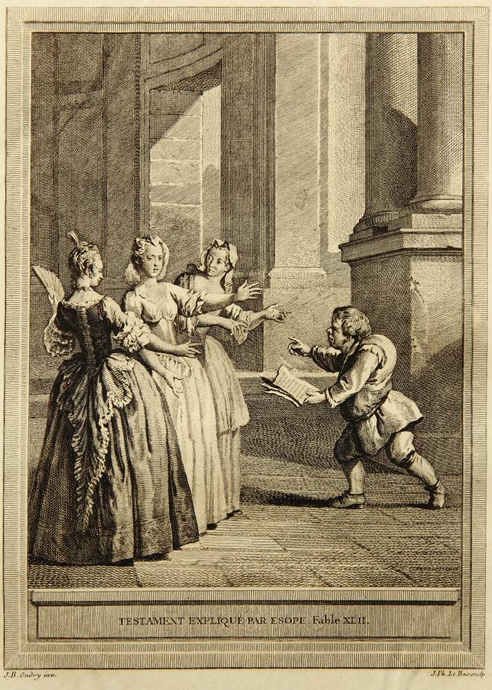 After Jean-Baptiste Oudry (1686 Paris – 1755 Beavais), Hunchback brings Aesop’s Testament, reprint, , Offset printing