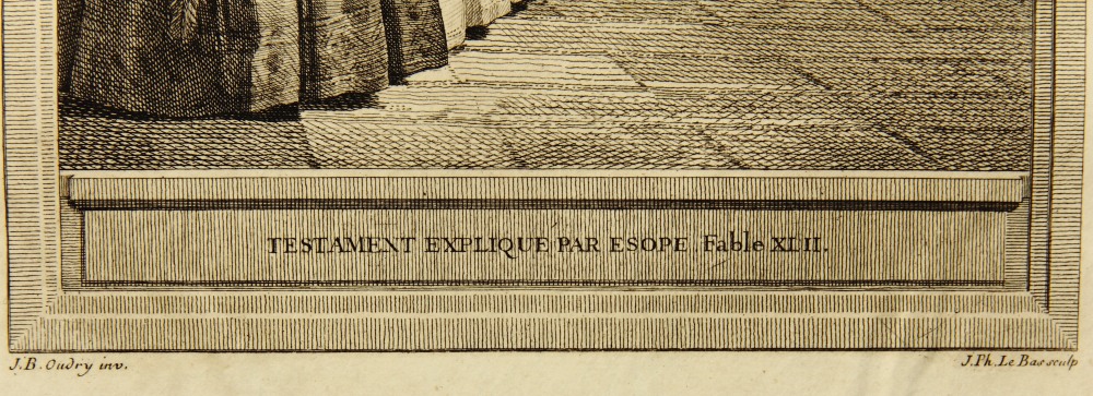 - Description: Illustration of a fable. After an original by Jean-Baptiste Oudry (1686 Paris – 1755 Beauvais). Titled in French in the illustration and signed in printing plate below.