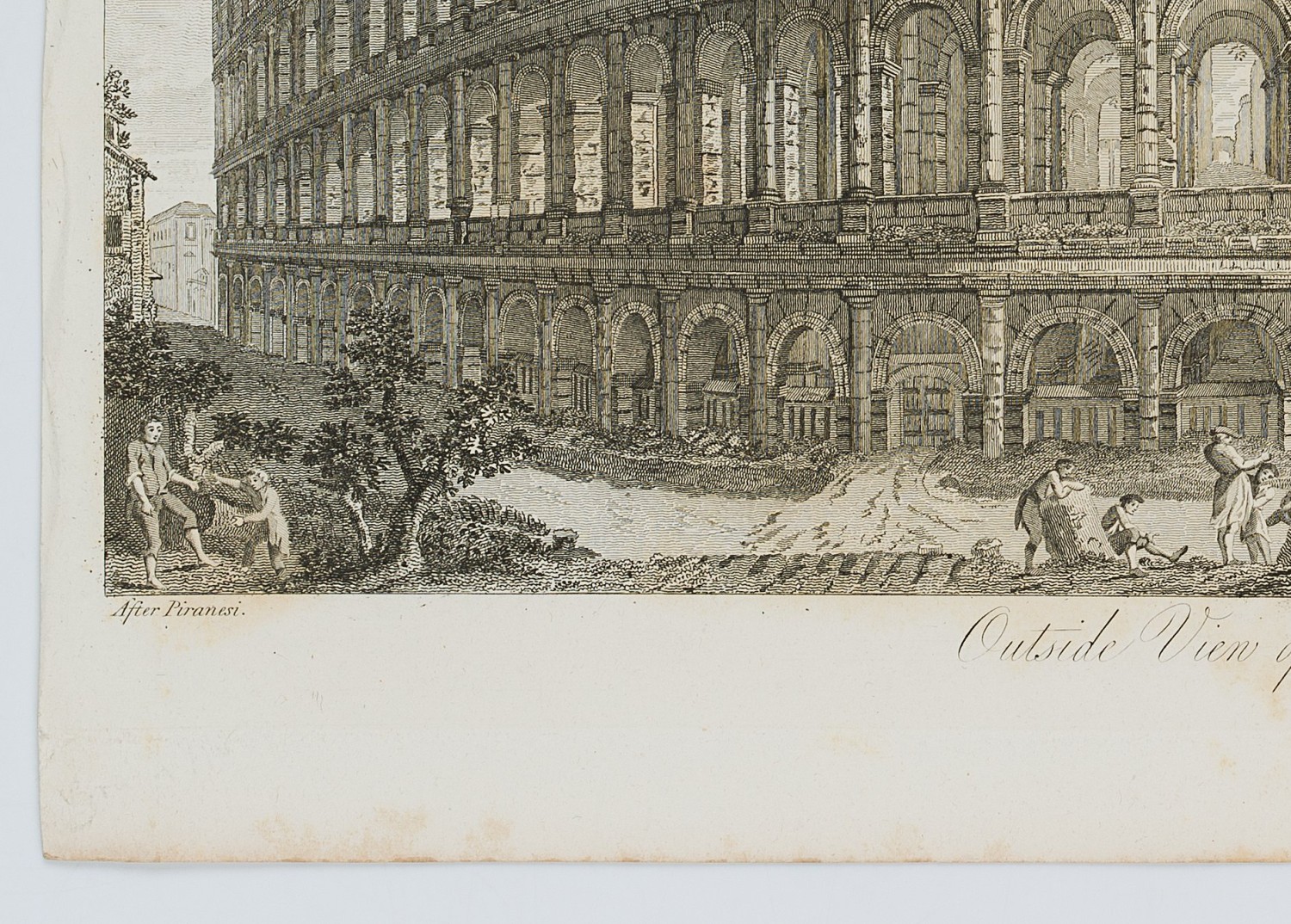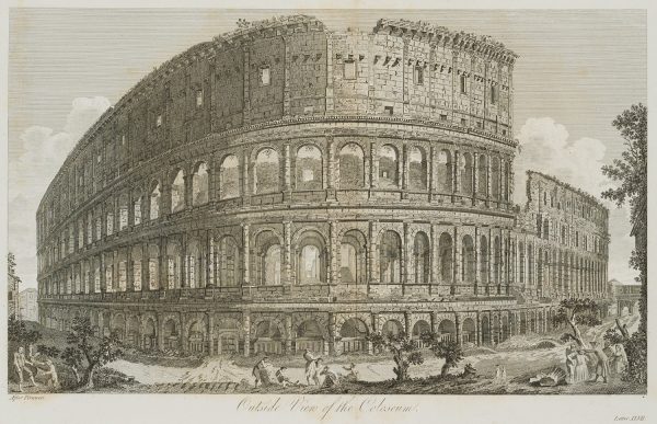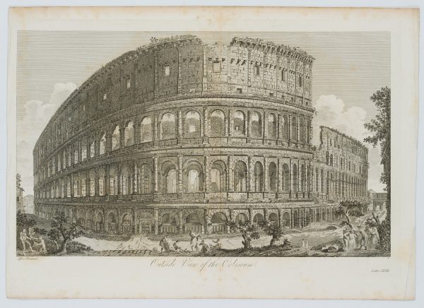 - Description: View from outside of the Colosseum with idle staffage figures in the foreground.