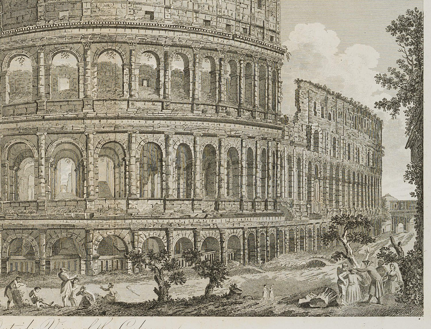 - Beschreibung: Blick von Außen auf das Kolosseum mit müßiggehenden Staffagefiguren im Vordergrund.