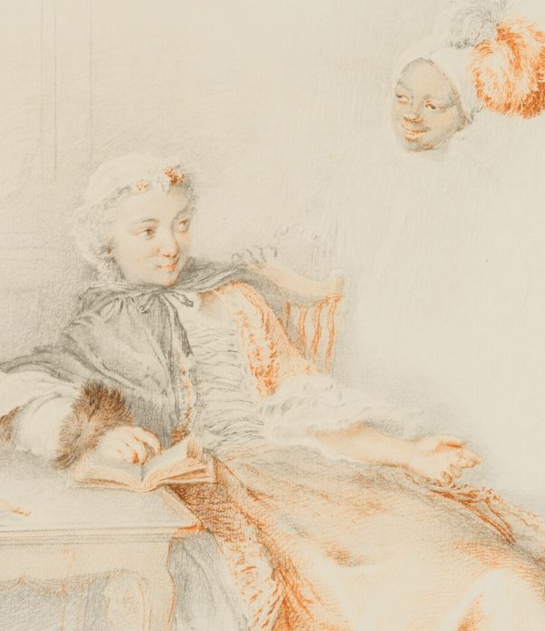 Nach Nicolas François Portail (18. Jahrhundert), Musische Dame in Rokoko-Kleid beim Kaffee, , Fotogravur