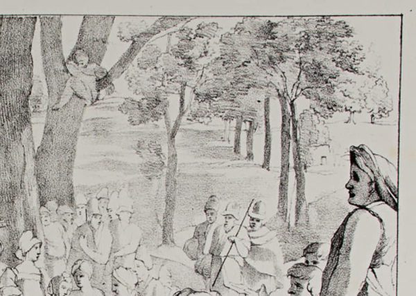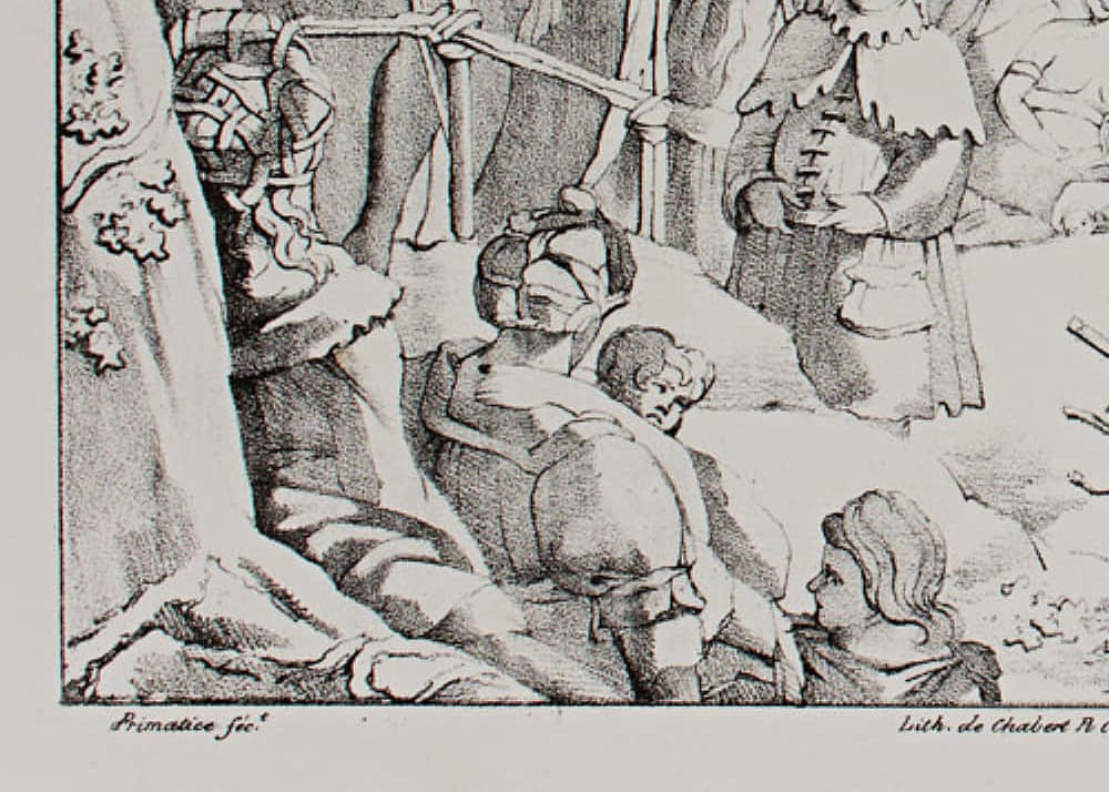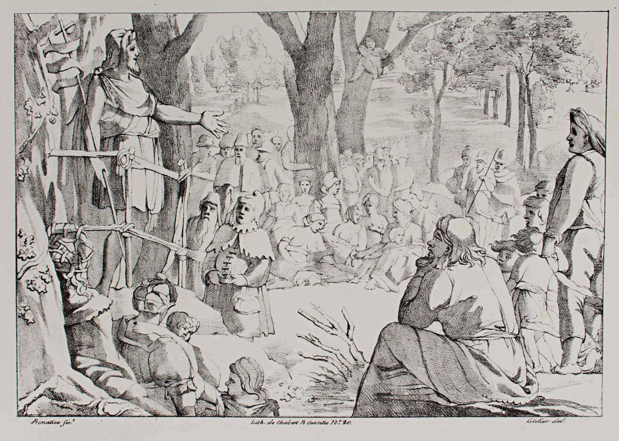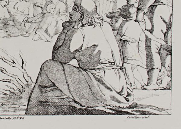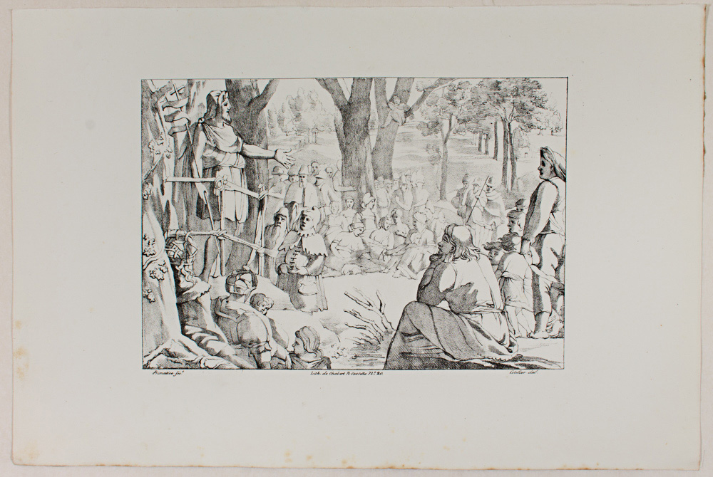 - Beschreibung: ,,Johannes (Jean) predigt in der Wildnis”, Lithographie eines Werkes von Primaticcio (1504 – 1570). Aus der Serie: Bilder der Romanischen Schule (Ecole Lombarde). Bezeichnet: Primatice fec Lith. de Chabert, rue Cassette N°. 20. Letelier del.
