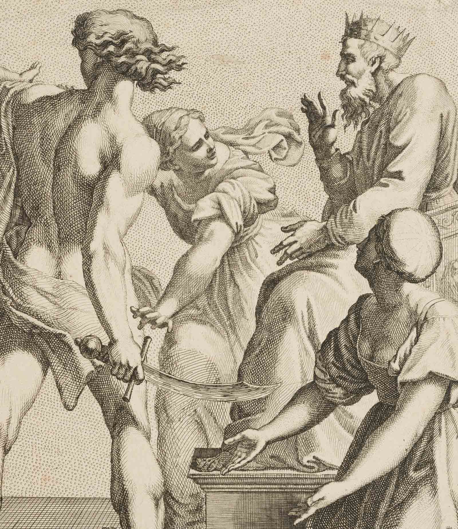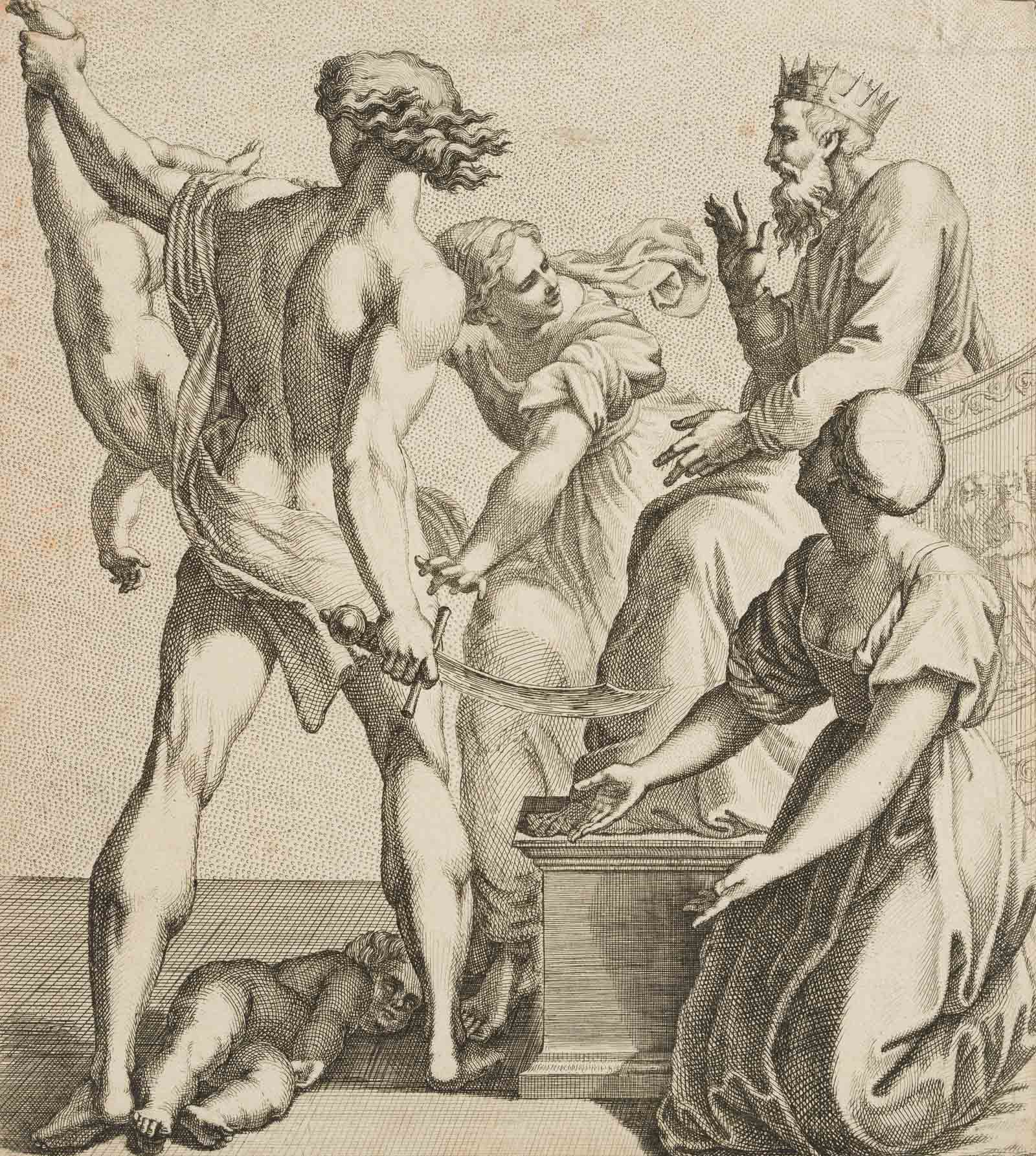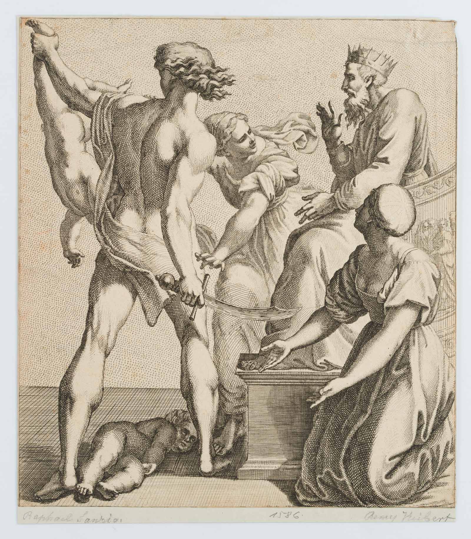 After Raffael: Raffaello Sanzio da Urbino (1483 Urbino – 1520 Rom), after Raphael, The Judgement of Solomon, Biblical Scene, King Solomon, 1690, wheel, 1690, Etching