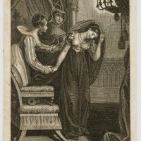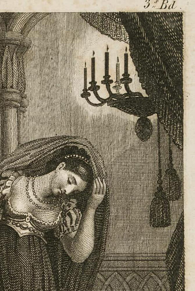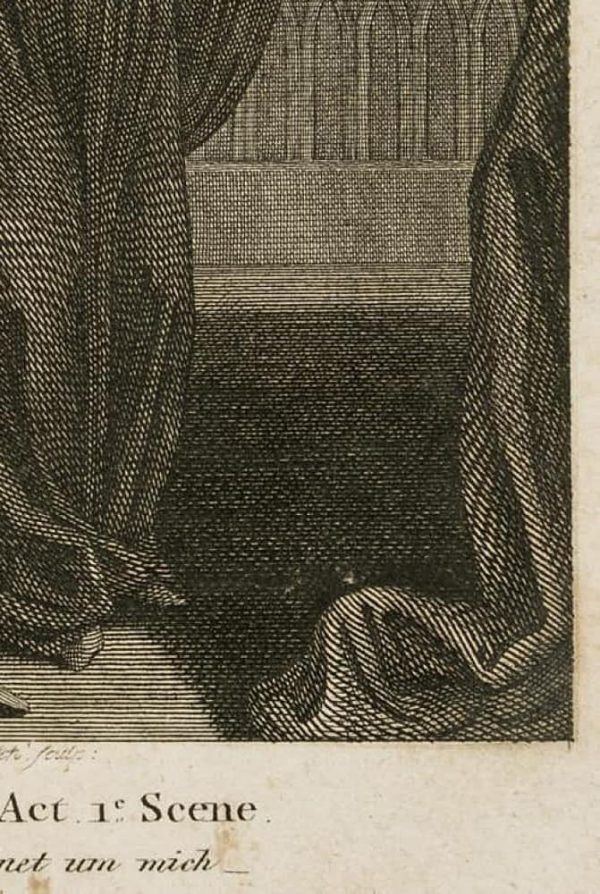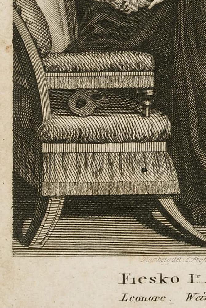 - Beschreibung: Abbildung unterhalb mit “Fiesko 1r Act. 1e Scene. Leonore. Weinet um mich” bezeichnet. Oberhalb nummeriert mit “3 Bd.”