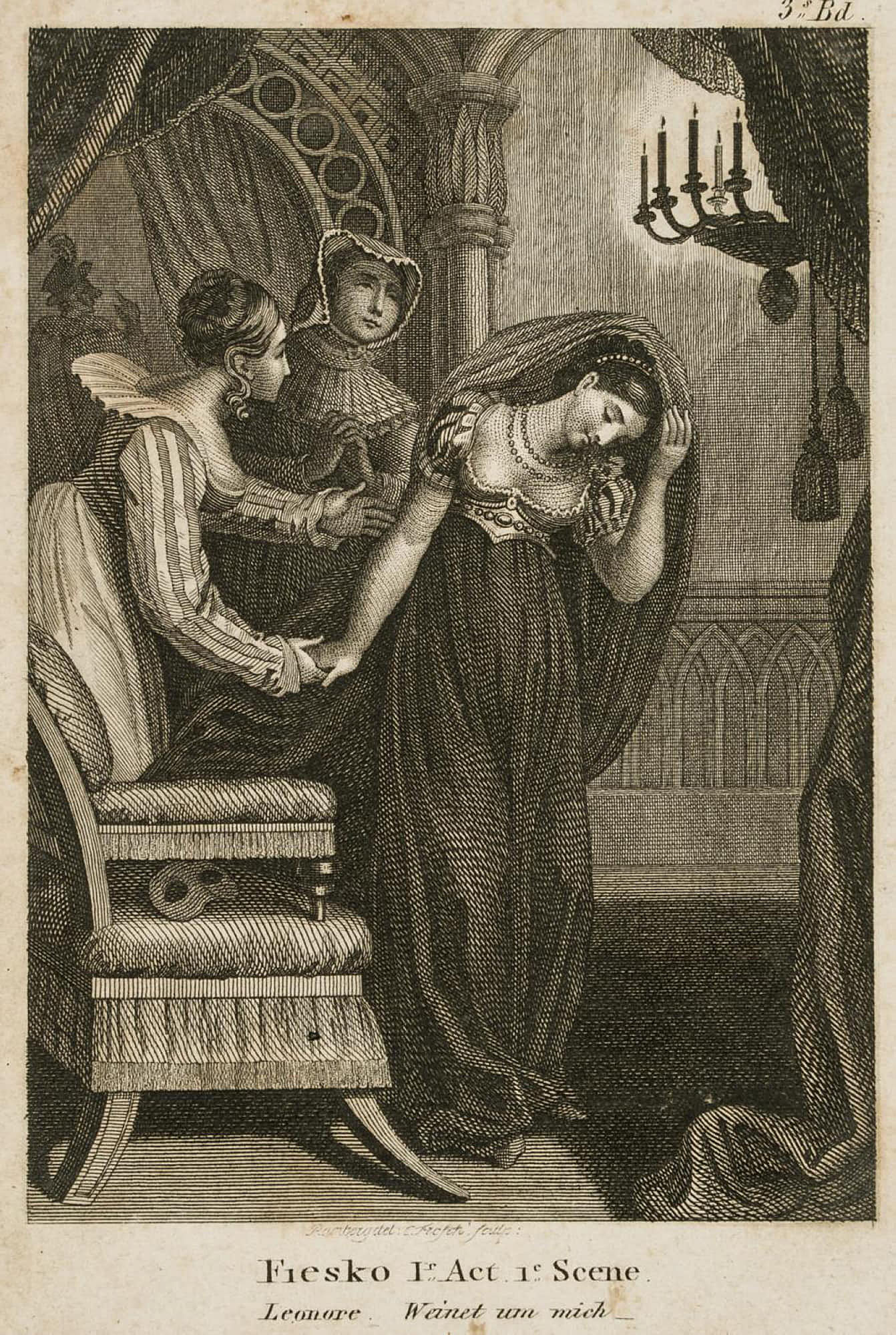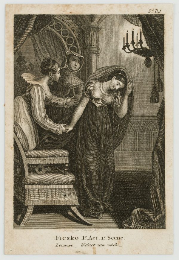 - Description: Illustration below with “Fiesko 1r Act. 1e Scene. Leonore. Cry for me”. Numbered “3 Bd.” above.