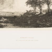 - Beschreibung: Heliographie einer Rembrandt Radierung. Blick über eine flache Landschaft mit drei Bäumen im Vordergrund, einem Landarbeiter und am Horizont eine kleine Siedlung
