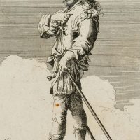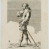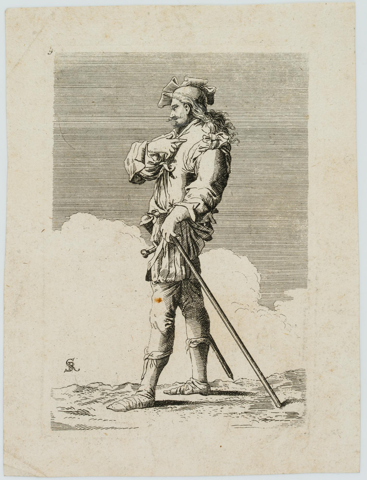 After Salvator Rosa (1615 Naples – 1673 Rom), Standing warrior with staff and sword, c. 1657, Etching