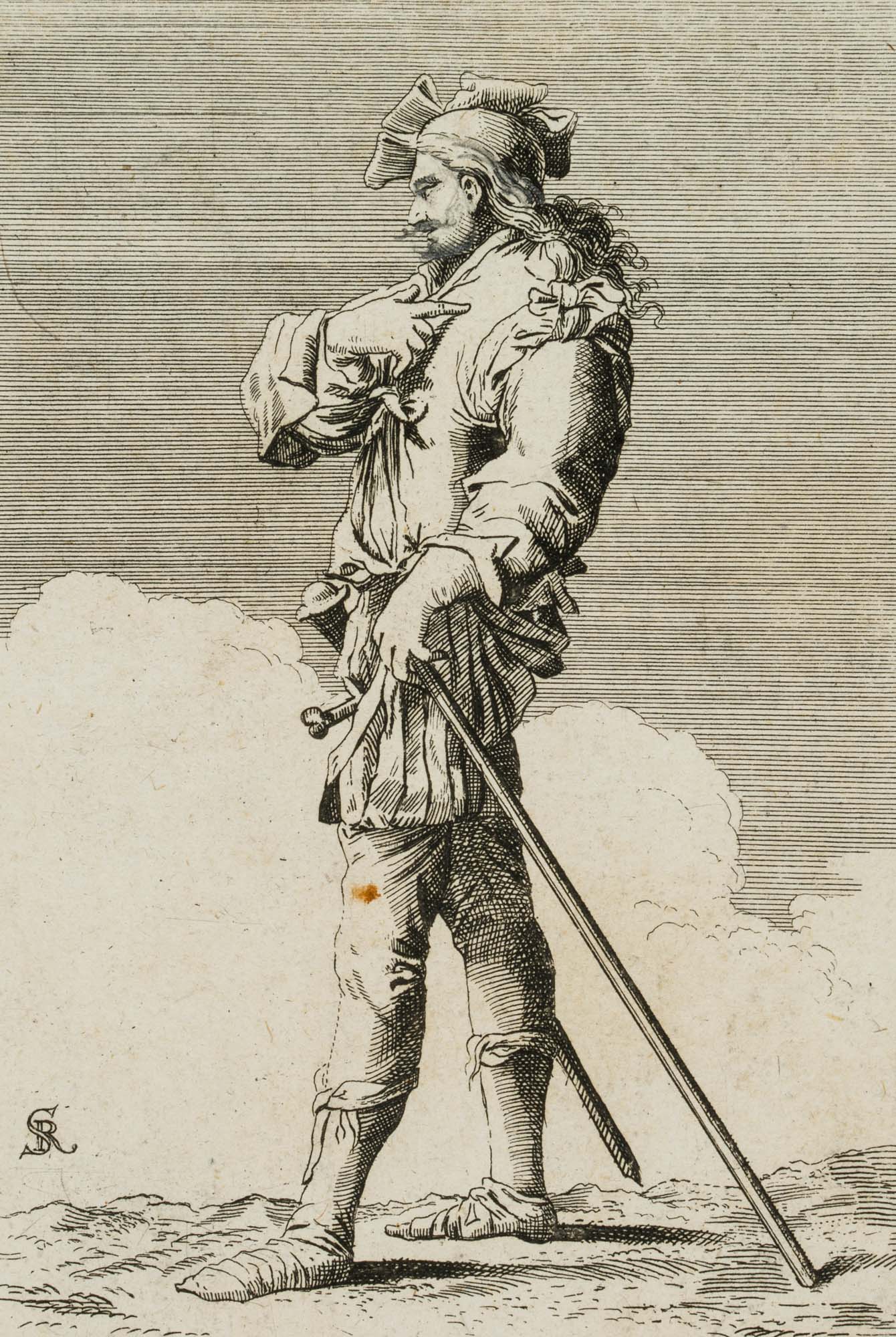 Nach Salvator Rosa (1615 Neapel – 1673 Rom), Stehender Krieger mit Stab und Schwert, um 1657, Radierung