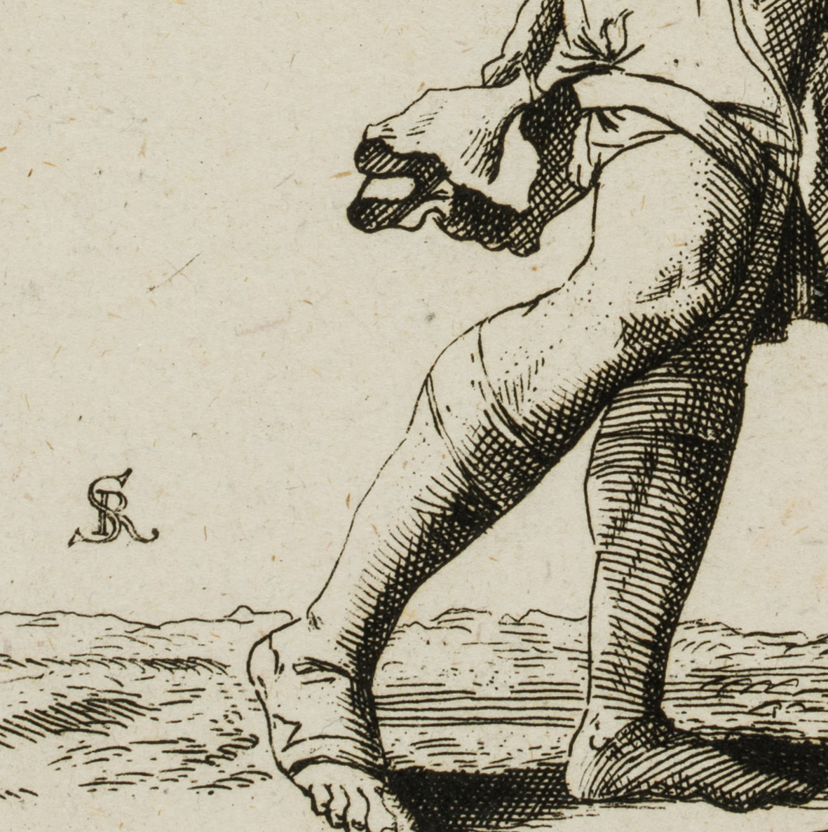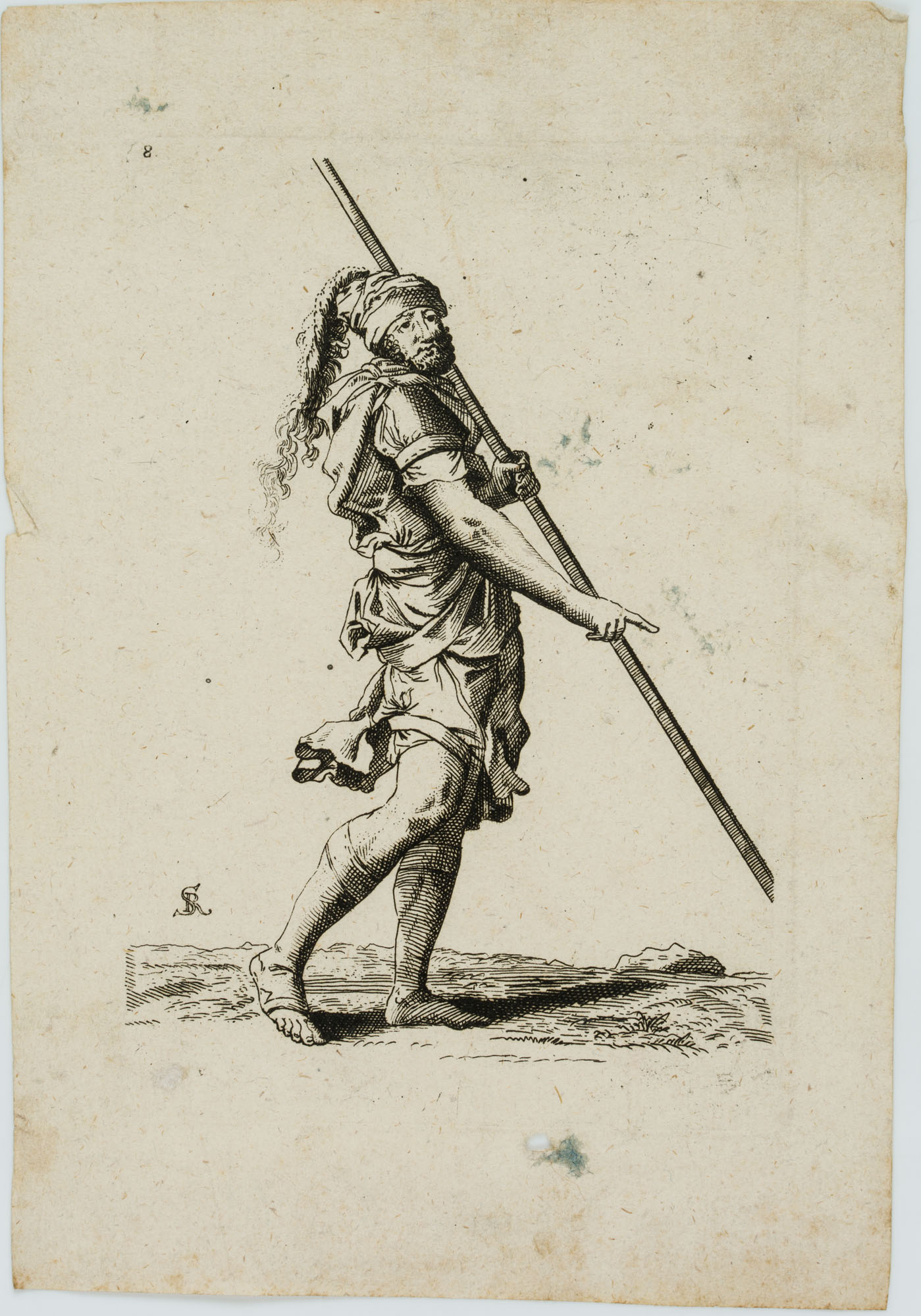 - Inscription: Monogrammed lower left: “SR” (ligatured); After Salvator ROSA (1615 Naples-1673 Rome), from: “Has Ludentis otij […]”, also called “Figurine”; numbered upper left: “8”.