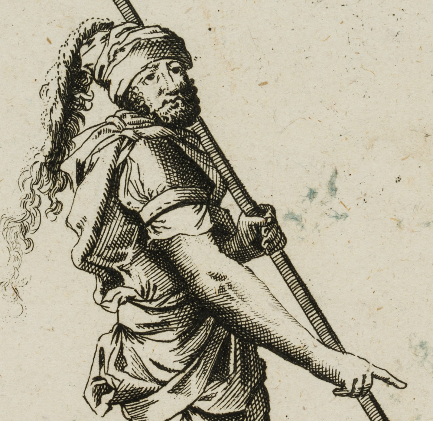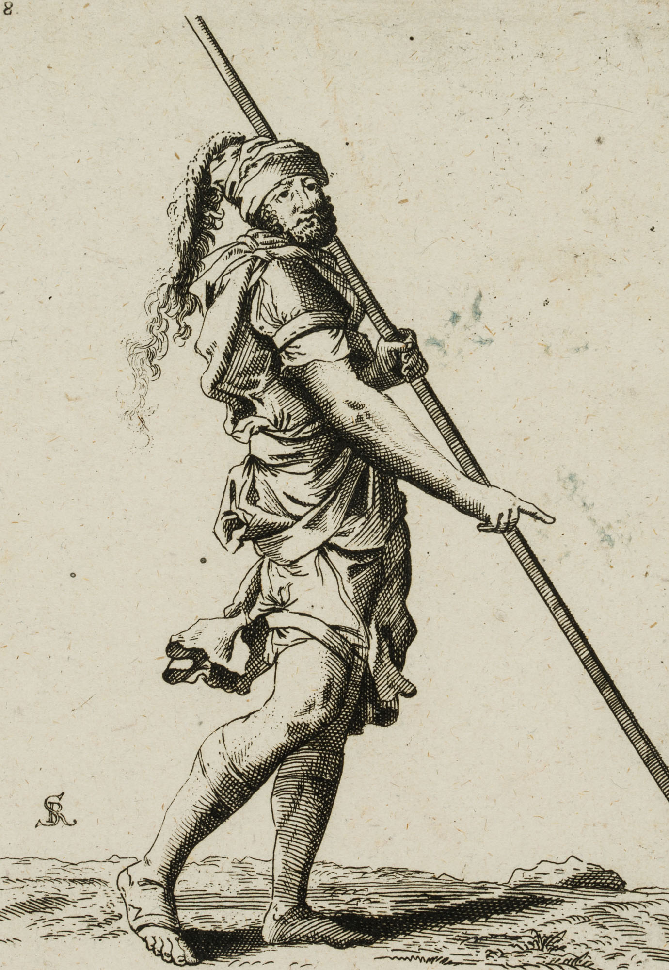 After Salvator Rosa (1615 Naples – 1673 Rom), Standing warrior with long staff, c. 1657, Etching