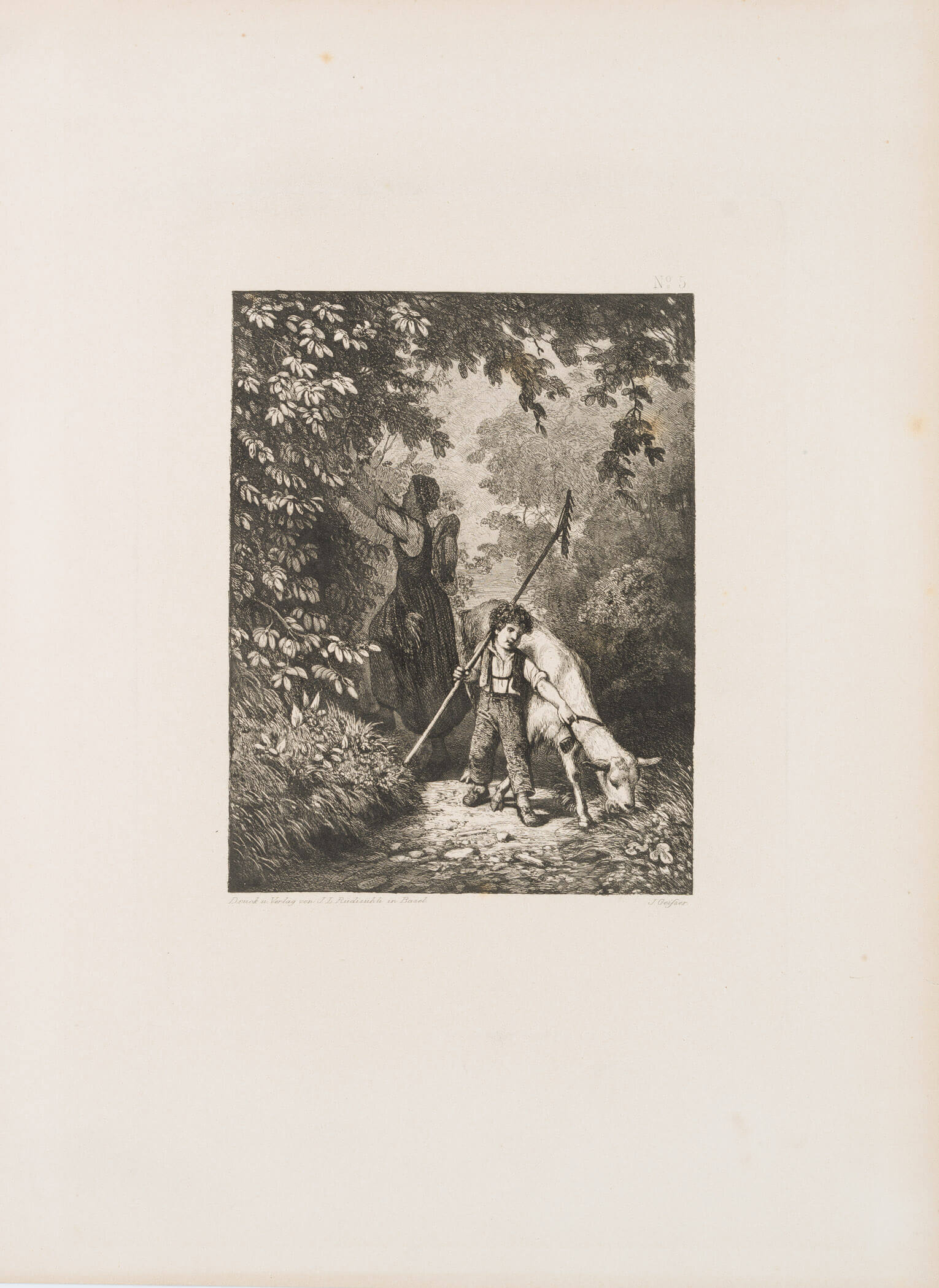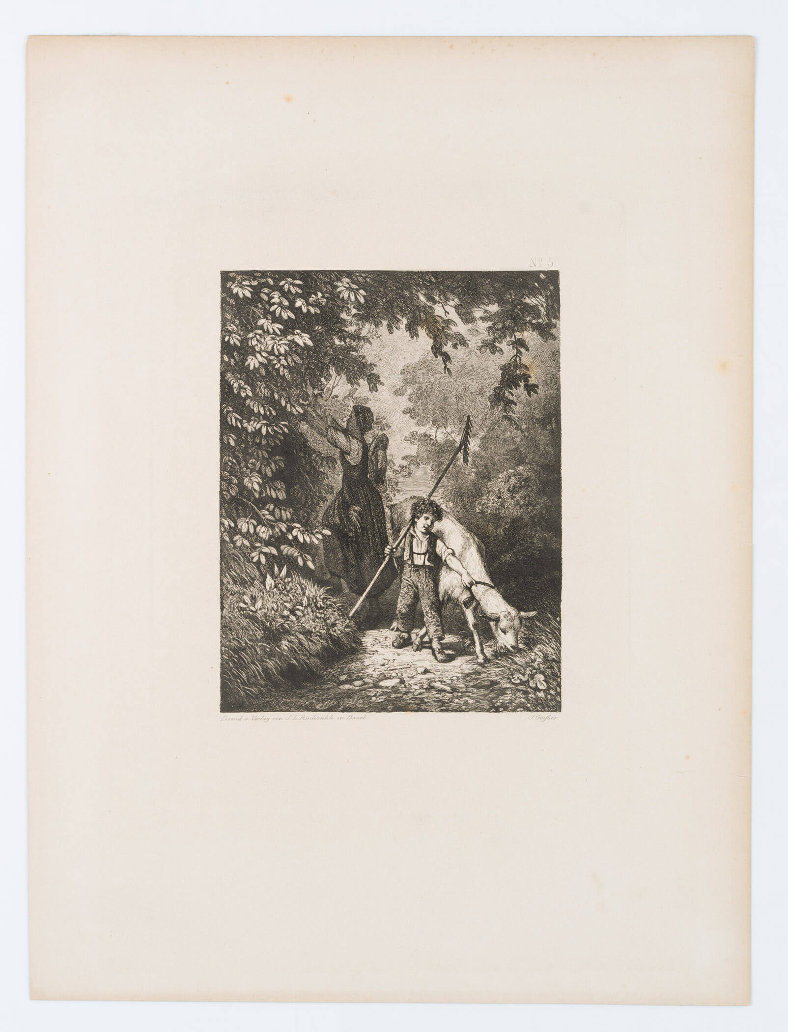 - Beschreibung: Radierung eines kleinen Jungen, der eine grasende Ziege am Halsband greift.