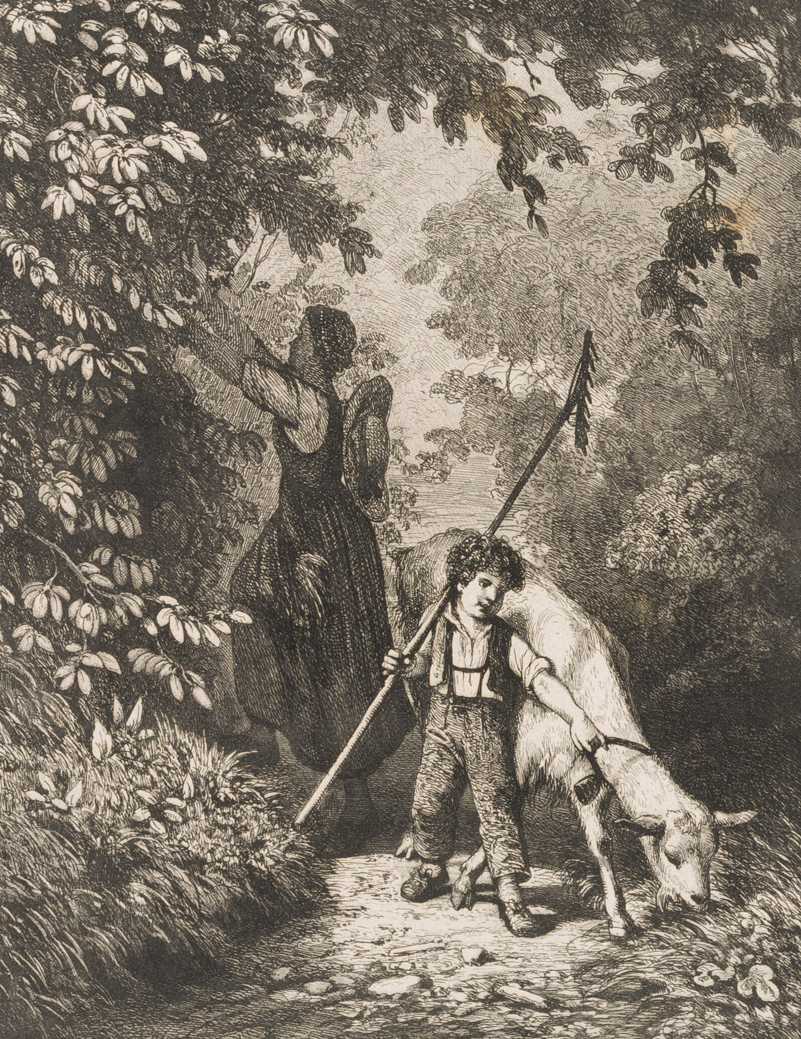 - Description: Etching of a small boy grasping a grazing goat by the collar.