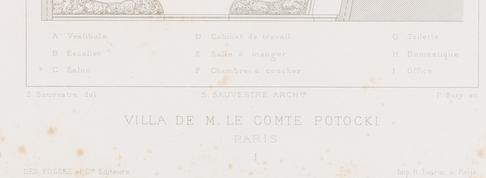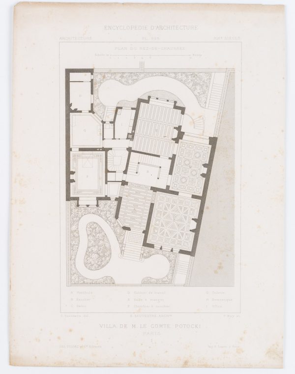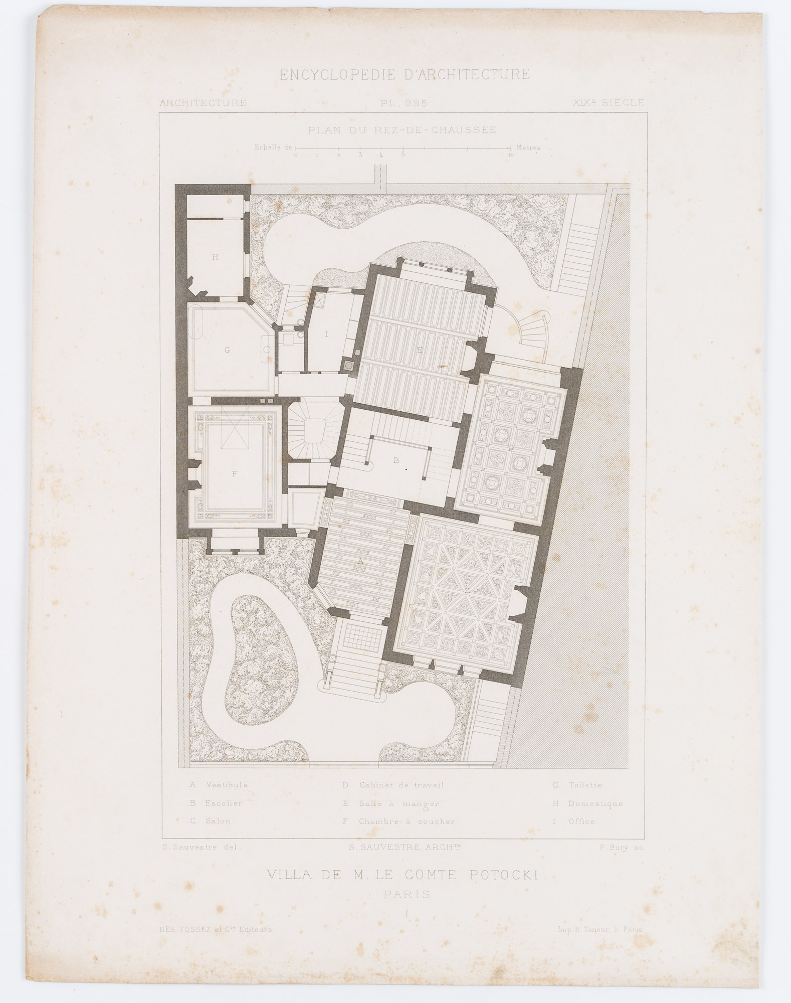 After Stéphen Sauvestre (1847 Bonnetable – 1909 ), Architectural illustration Floor plan of the Villa de M le Comte Potocki, Paris, 19th century, Steel engraving