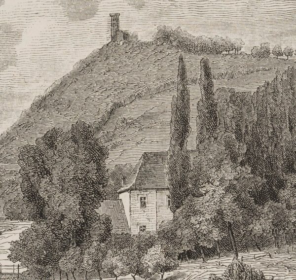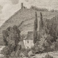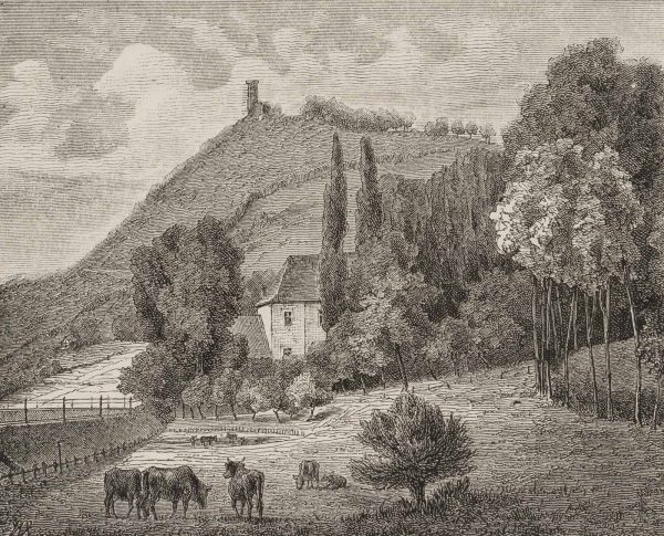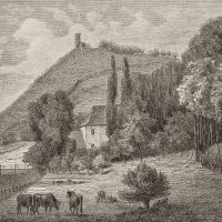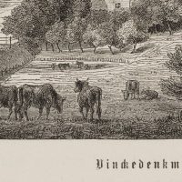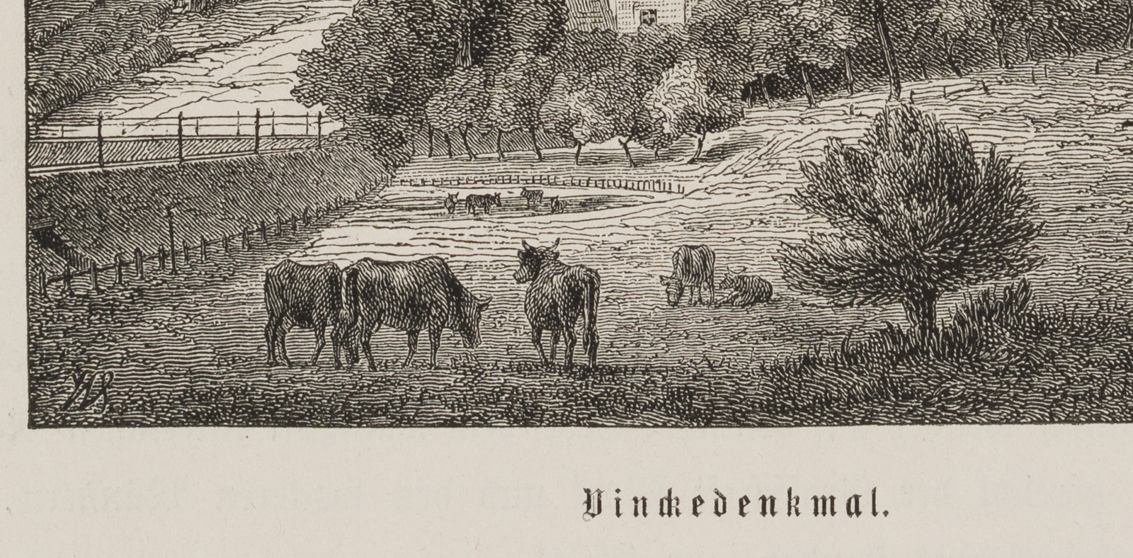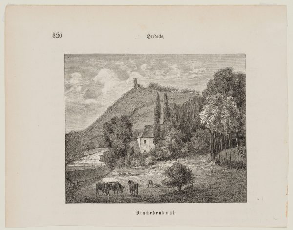 Nach Werner Wilhelm Schuch (1843 Hildesheim – 1918 Berlin), Blick vom Tal mit Wiesen und grasenden Rindern auf den Syberg (Ardeygebirge) mit dem Vinckedenkmal, ein achteckiger neugotischer Aussichtsturm, Herdecke, 19. Jahrhundert, Holzstich