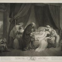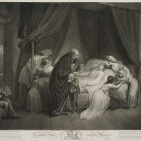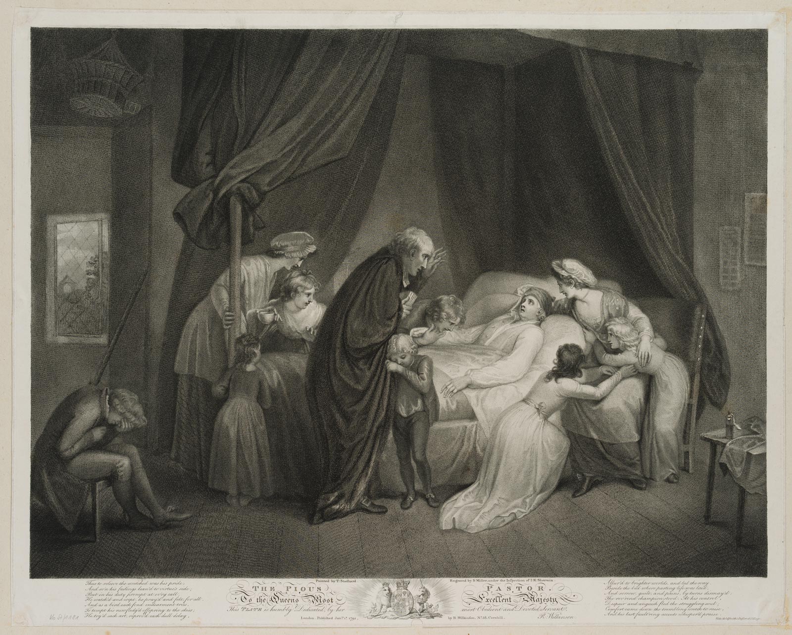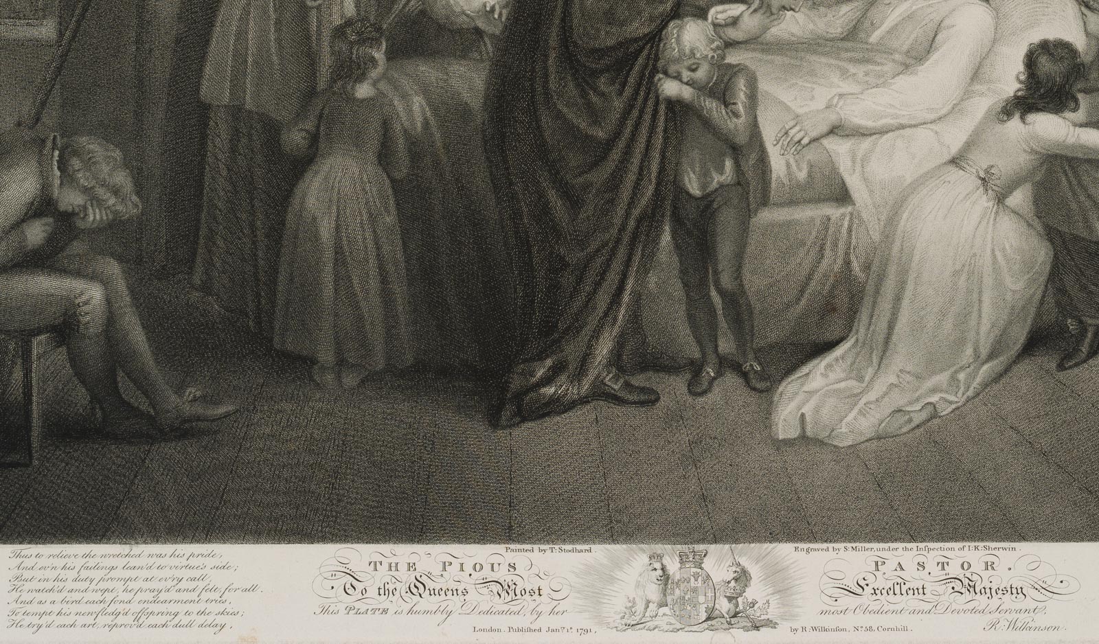 Marked below the image with title, dedication to the Queen around the coat of arms from the publisher, 14 lines by Goldsmith: ‘Thus to relieve the wretched was his pride … And his last fault’ring accents whisper’d praise. / Vide Goldsmith’s Deserted Village’ and ‘Painted by T. Stodhard / Engraved by S. Miller, under the inspection of J. K. Sherwin / London, Published Jany. 1st. 1791, by R. Wilkinson, No. 58 Cornhill”.