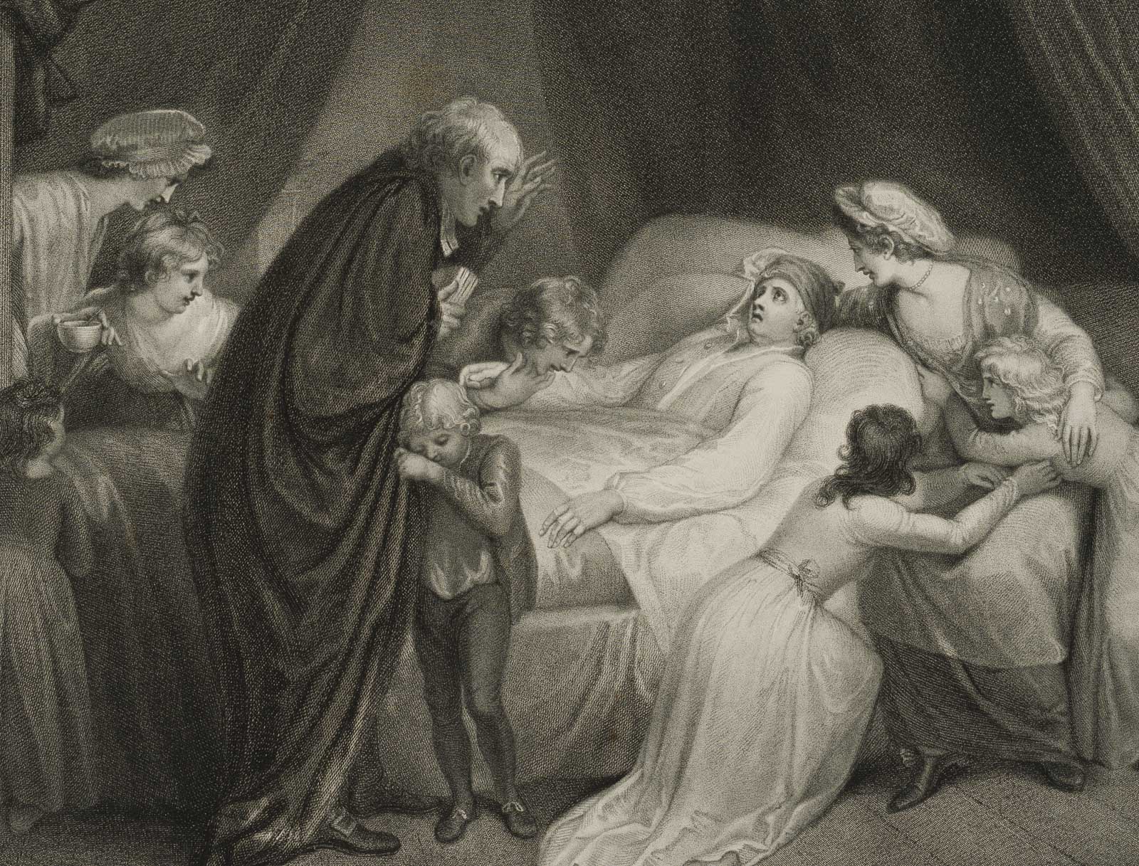 Im Zentrum des Bildes steht ein Pastor, der sich über das Bett eines sterbenden Mannes lehnt und einen Segen gibt, während die Familie um ihn herum trauert: ein kleiner Junge, der sein Gesicht in die Gewänder des Klerikers gräbt, ein älterer Junge, der von der Gruppe links abgeschieden sitzt, sich nach vorne beugt und sein Gesicht bedeckt.