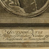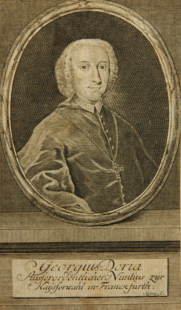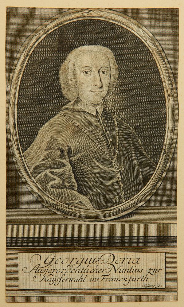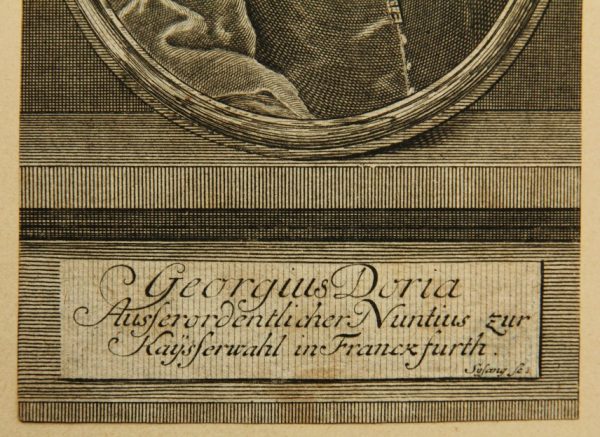 - Beschreibung: Johann Christoph SYSANG (1703 Leipzig – 1757 ebd. ), Büstenporträt des Georgius Doria, Außerordentlicher Nuntius, von Papst Benedikt XIV. im Jahre 1741 zur Kaiserwahl nach Frankfurt bestellt, Kupferstich. Beschreibung:Kupferstich mit stellenweiser Punktiermanier auf Papier. Unterhalb des Porträts in der Druckplatte mit Namen und Amt des Dargestellten versehen sowie vom Künstler signiert. Rückseitig befindet sich ein Sammlungsstempel mit dem Monogramm “EK”.
