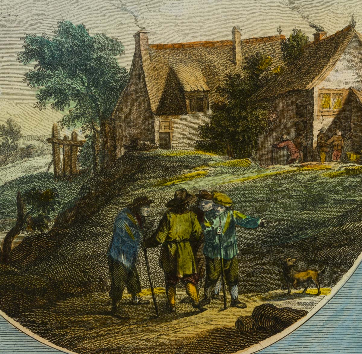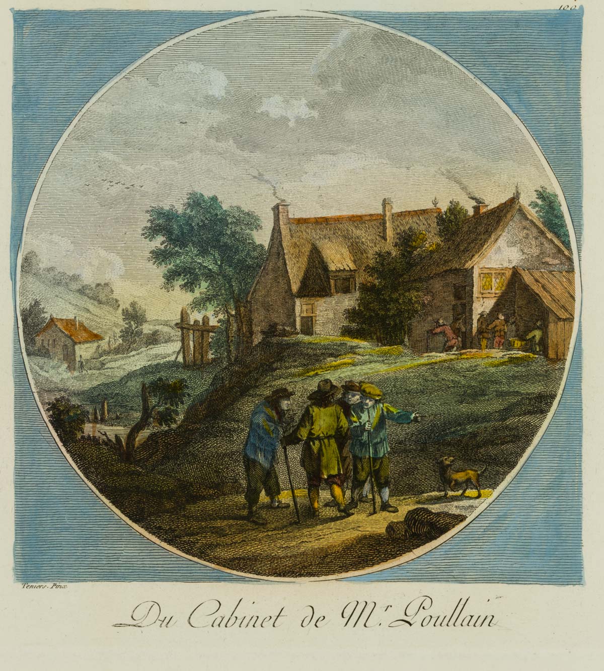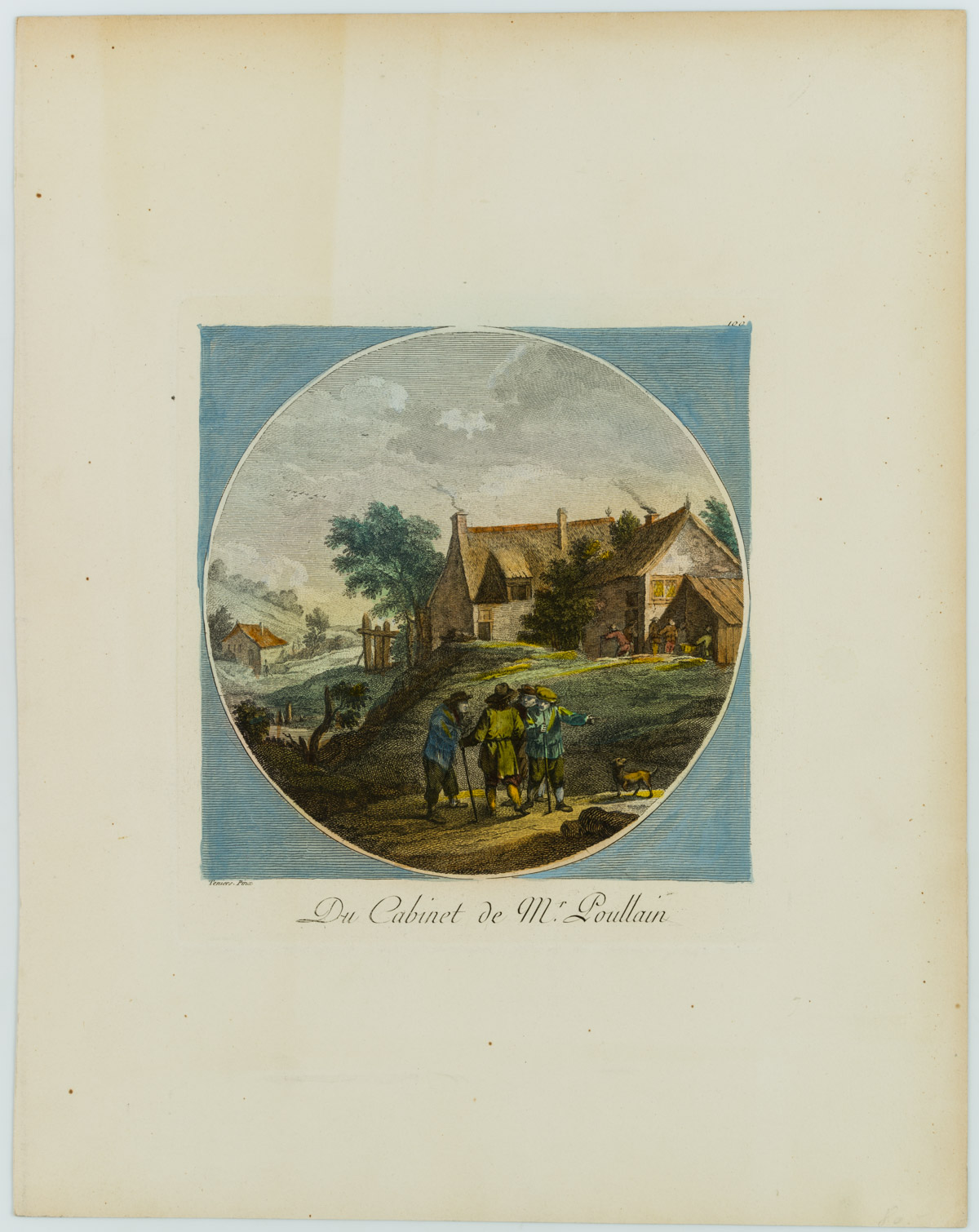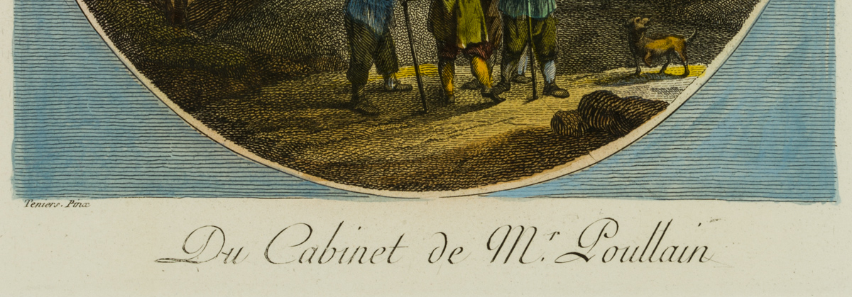 - Description: inscribed “Teniers pinx.”, named “Du Cabinet de Mr. Poullain”. View of a small village, where a group of peasants has gathered in the foreground to talk. In the middle ground a building can be seen, possibly a tavern, in front of which there are other figures. The depiction is particularly captivating because of its colour-intensive colouring.