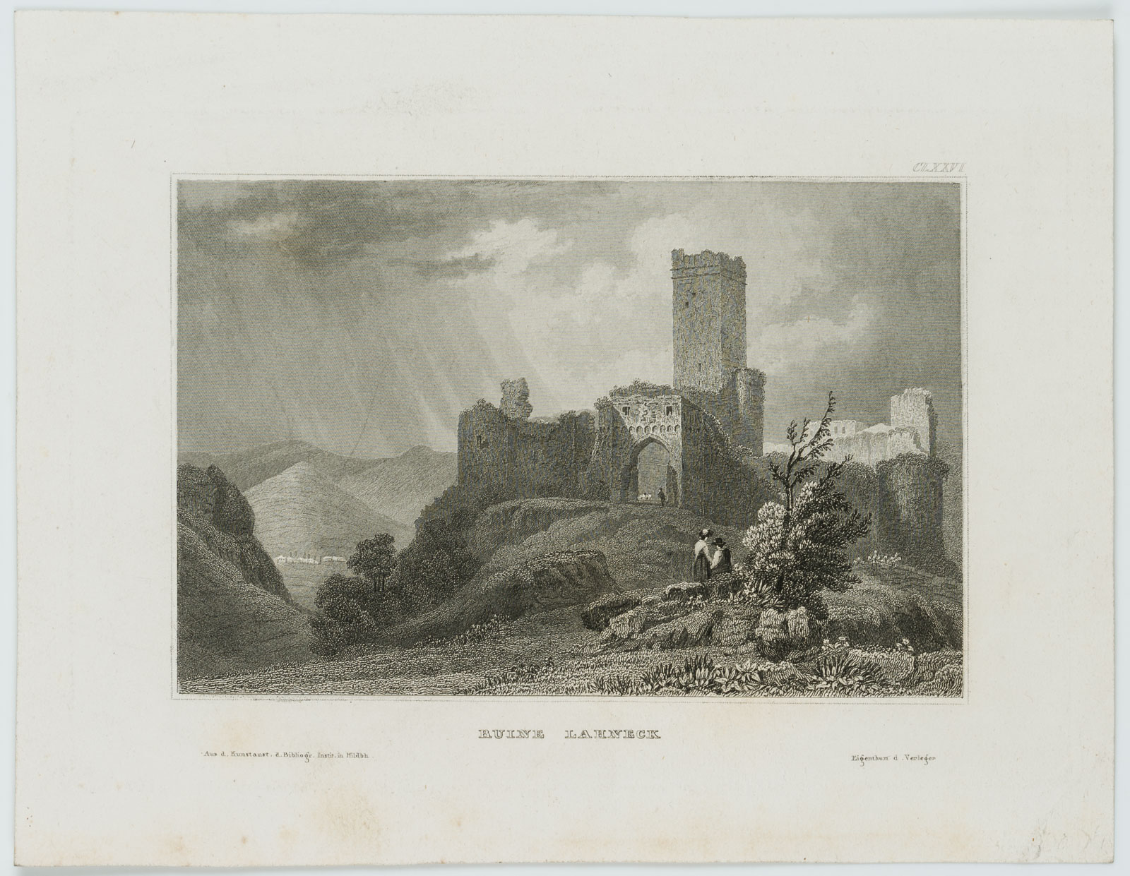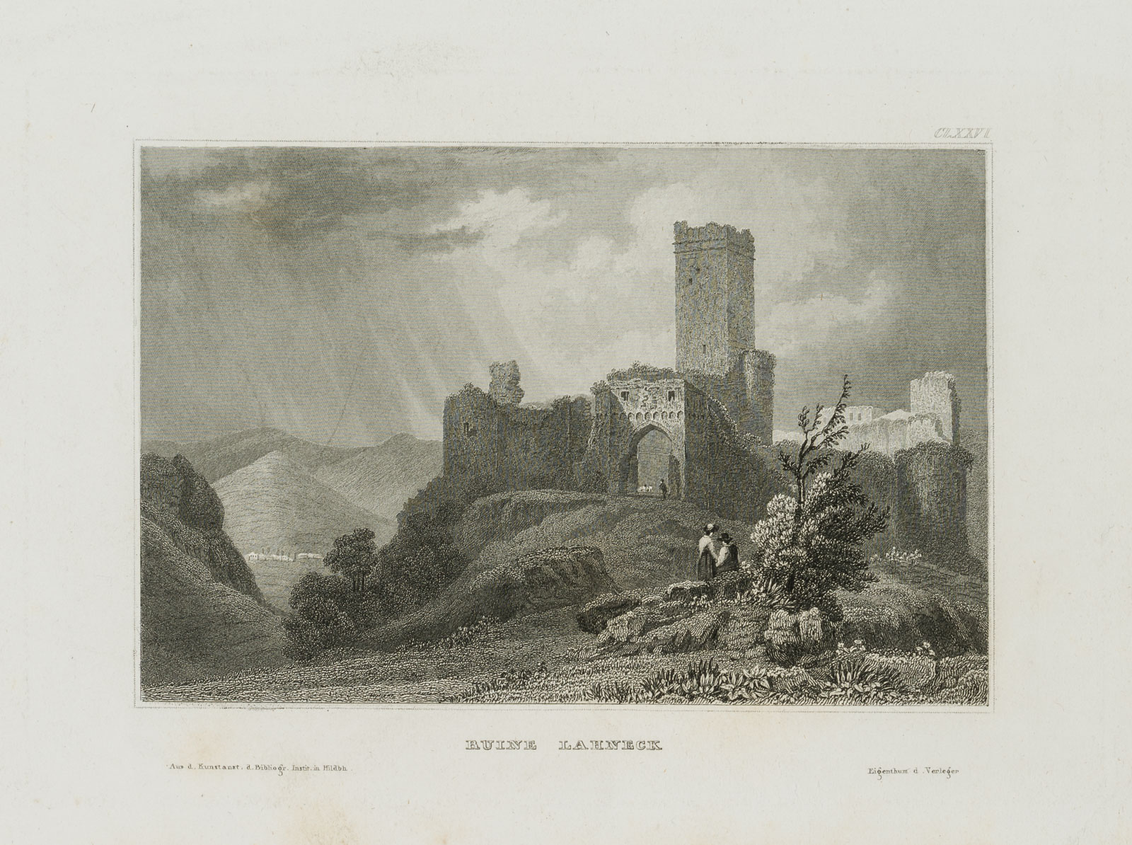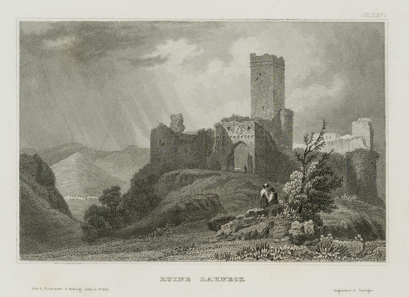 Romantische Gebäudeansicht mit rastendem Paar im Vordergrund, im Tor ein Hirte mit Tieren. Besonders sticht der Bergfried hervor mit seinem im Burgenbau selten anzutreffenden fünfeckigen Grundriss. Die Burg Lahneck ist eine in der ersten Hälfte des 13. Jahrhunderts auf einem stel hervorspringenden hohen Felsensporn über dem linken Lahnufer an der Lahnmündung erbaute Spornburg. Sie steht in Lahnstein am Rhein und Lahn gegenüber Schloss Stolzenfels. - Datierung: um 1830