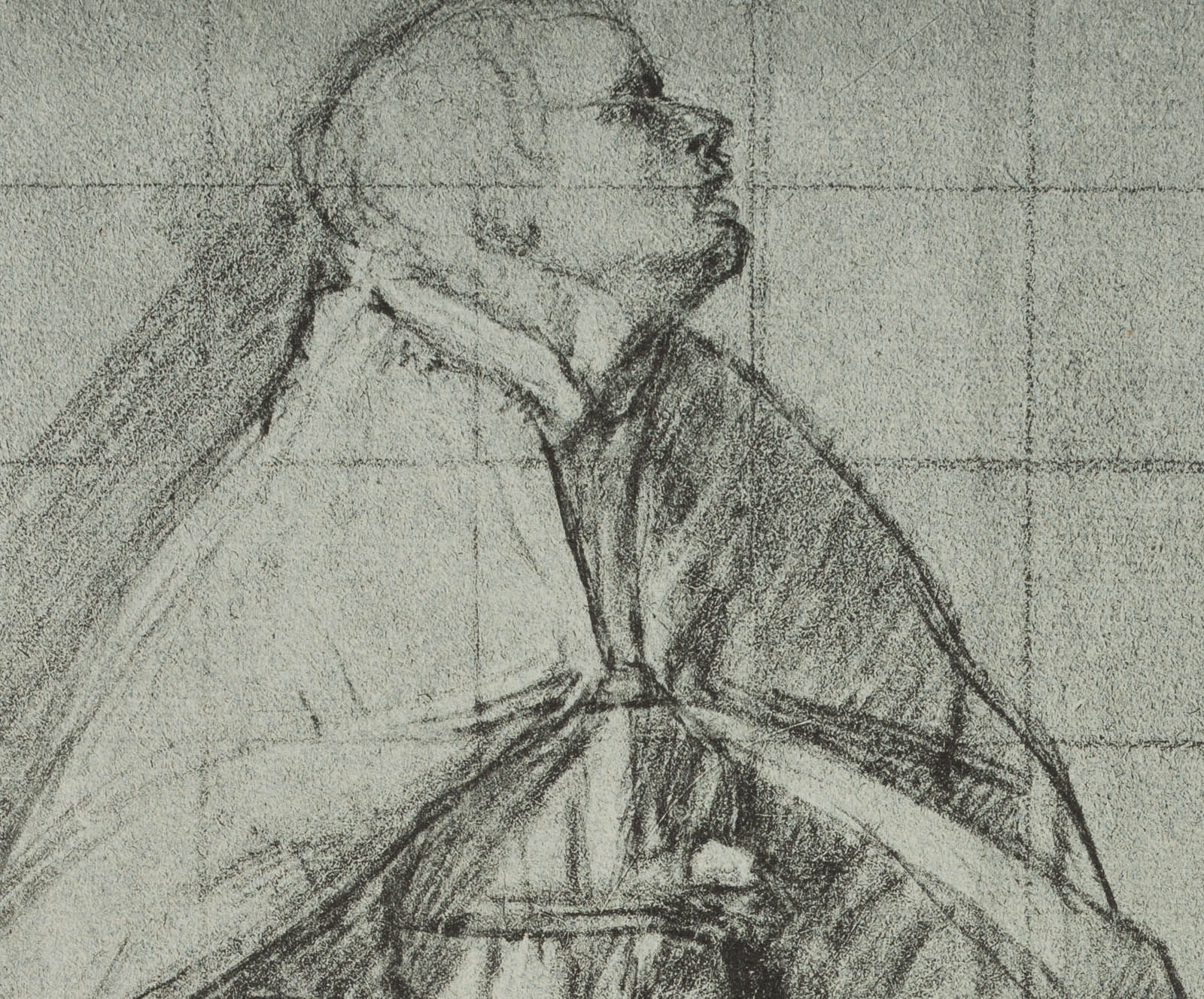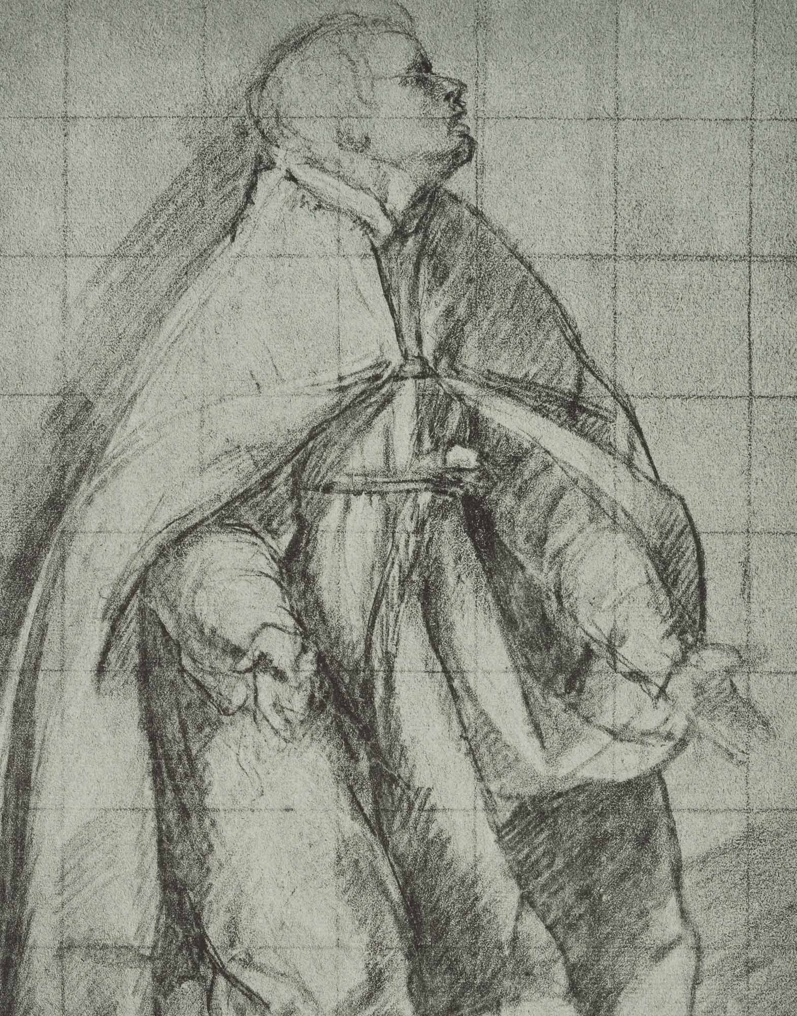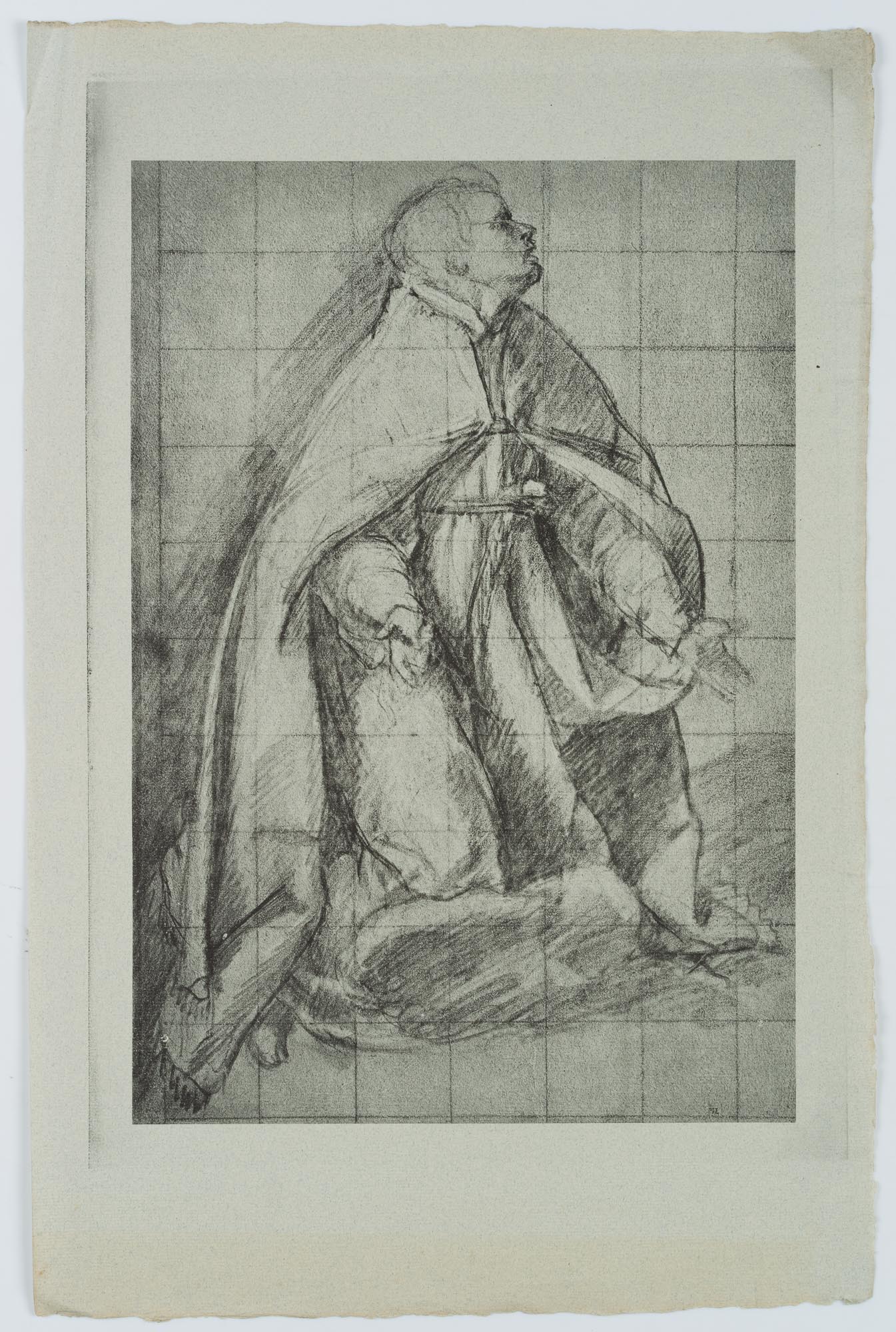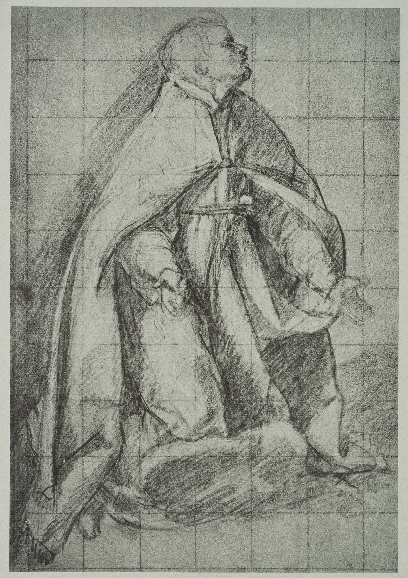 After Unknown (16th century), Depiction of a kneeling praying man with open arms and wearing a wide cloak, presumably a master sketch and part of a saint’s picture, 19th century, Reproduction