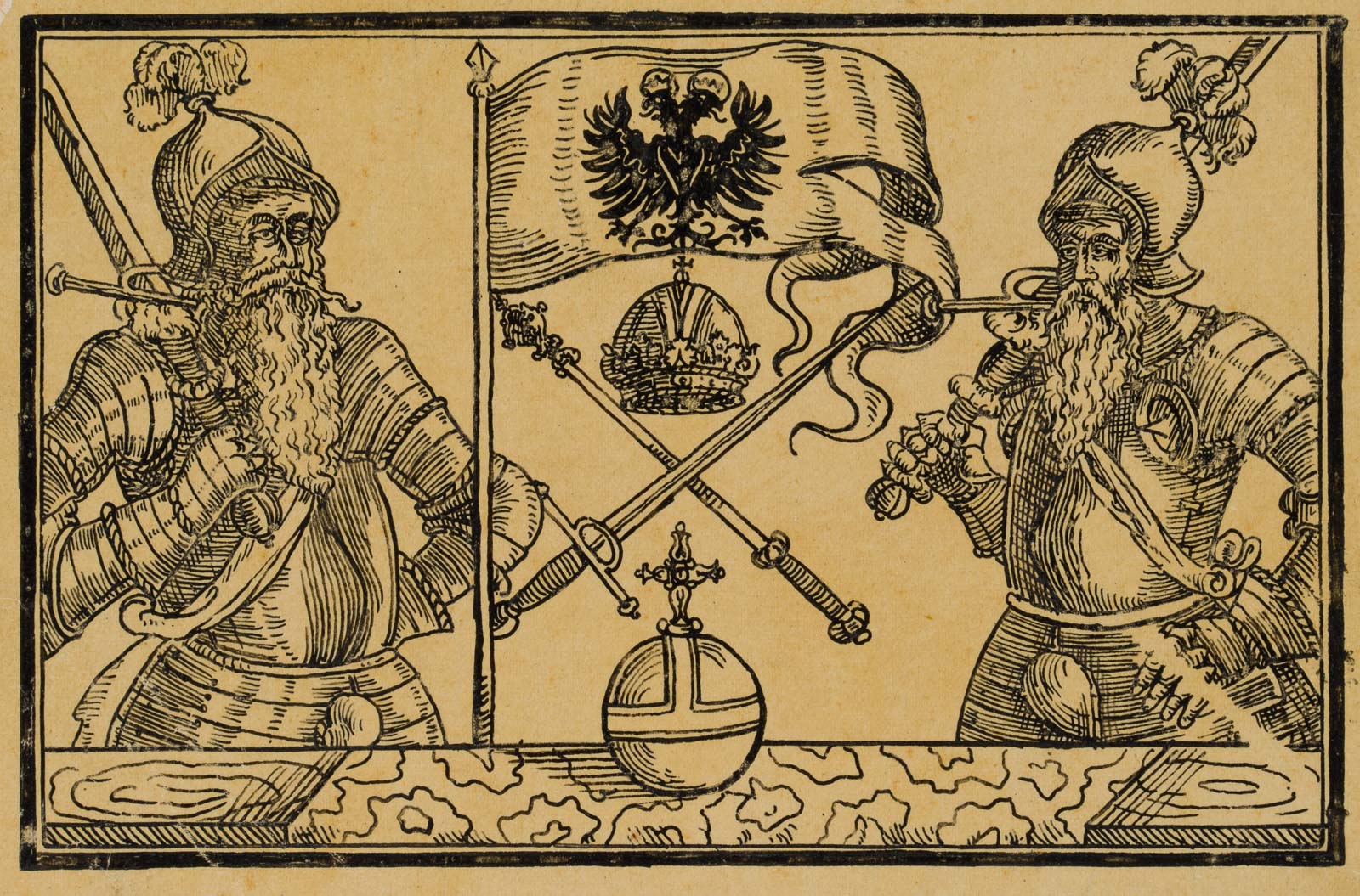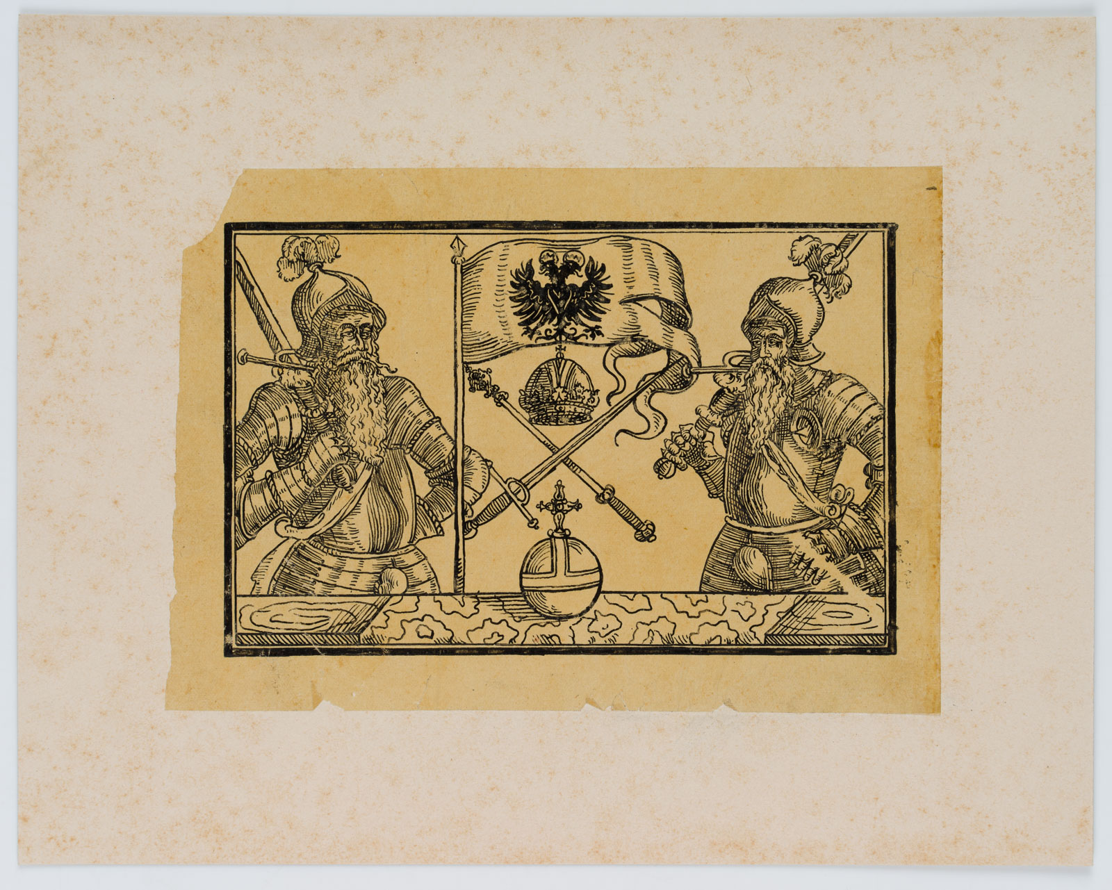 - Description: Probably after a 15th/16th century woodcut by Lucas Cranach or Albrecht Dürer. Showing two armed men in armour next to the imperial crown, sceptre, sword and imperial orb under a flag with double-headed eagle.