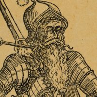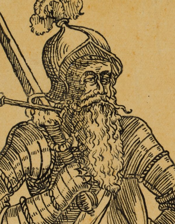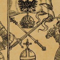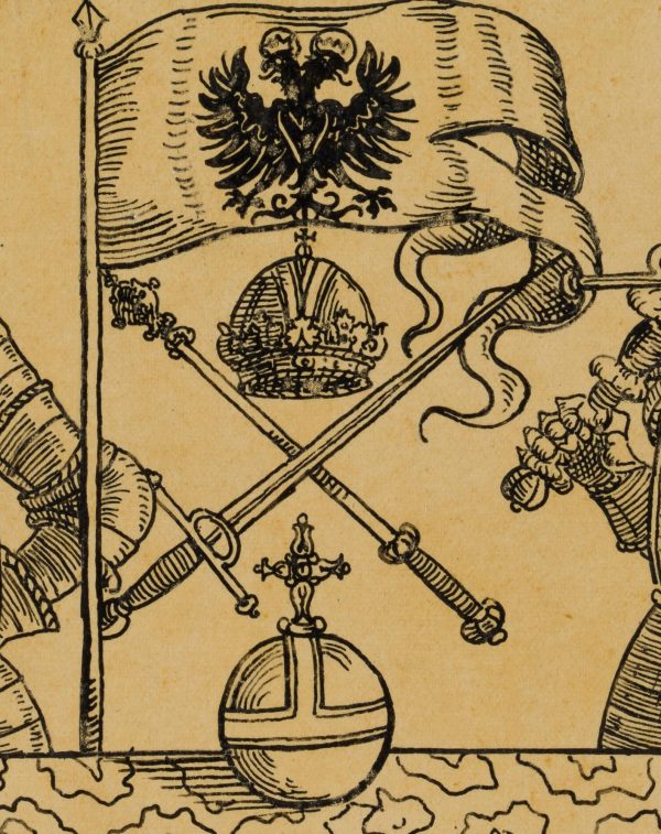 - Beschreibung: Vermutlich nach einem Holzschnitt des 15./16. Jahrhunderts aus dem Umkreis Lucas Cranachs oder Albrecht Dürers. Zeigt zwei gerüstete im Harnisch neben Reichskrone, Zepter, Schwert und Reichsapfel unter Flagge mit Doppeladler.