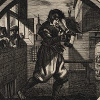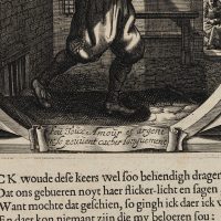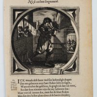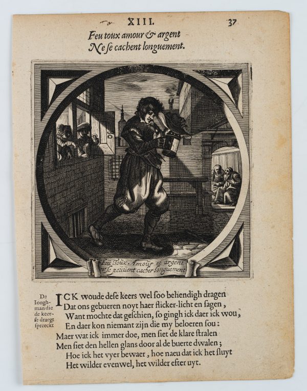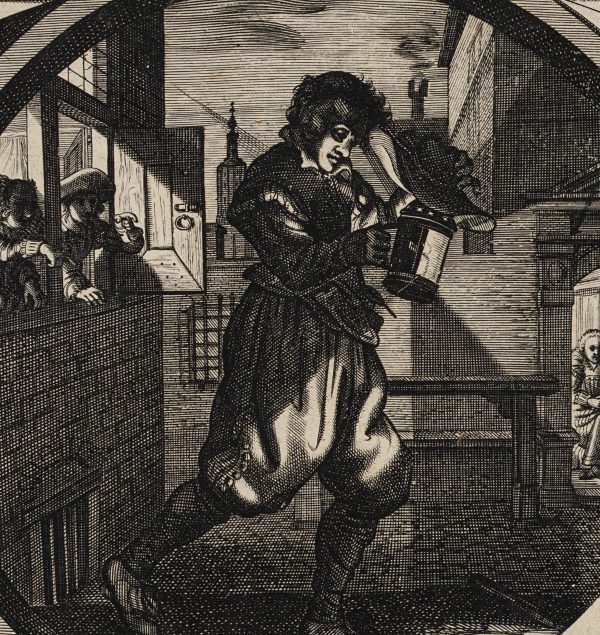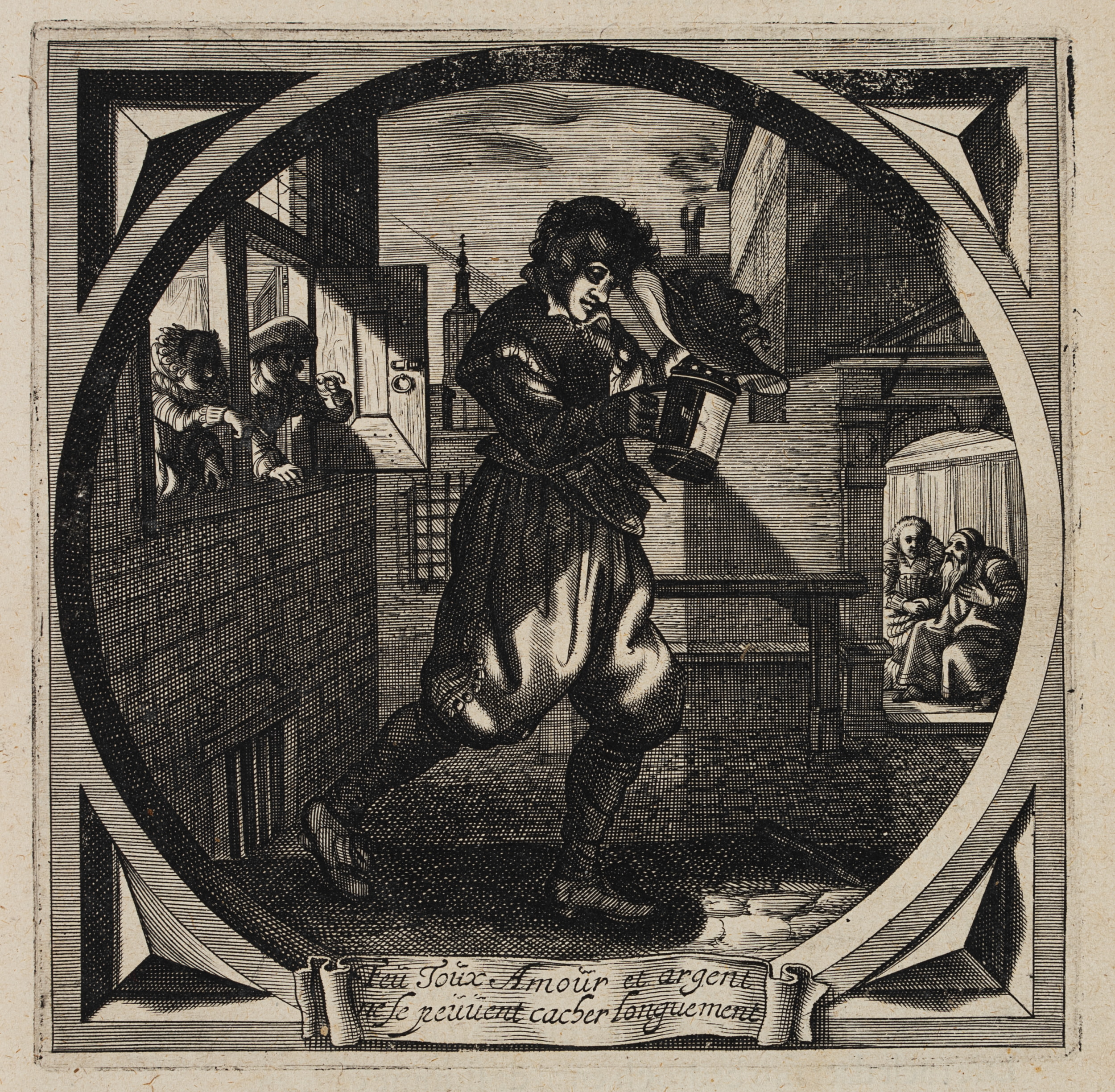 • Description: A man darkening his lantern with his hat, trying to steal away in the dark. A man and a woman watch him from a window of the house on the left. On the right edge of the picture, an old man and a woman sit in the background. The foreground is adorned by a kind of faceted stone decoration that gives a circular view of the scene. At the bottom of the picture are the artist’s and etcher’s monograms and a banner.