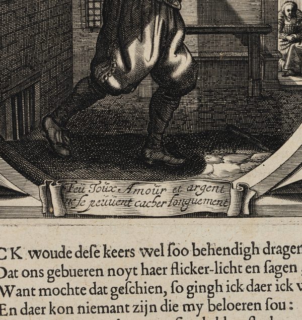 • Inscription: Lower middle inscribed in the printing plate: “Feu Toux Amour et argent ne se peuvent cacher longuement”.