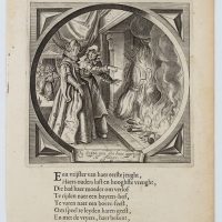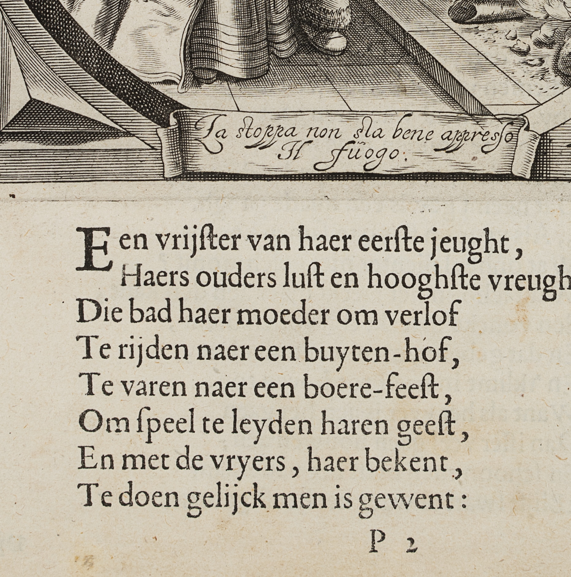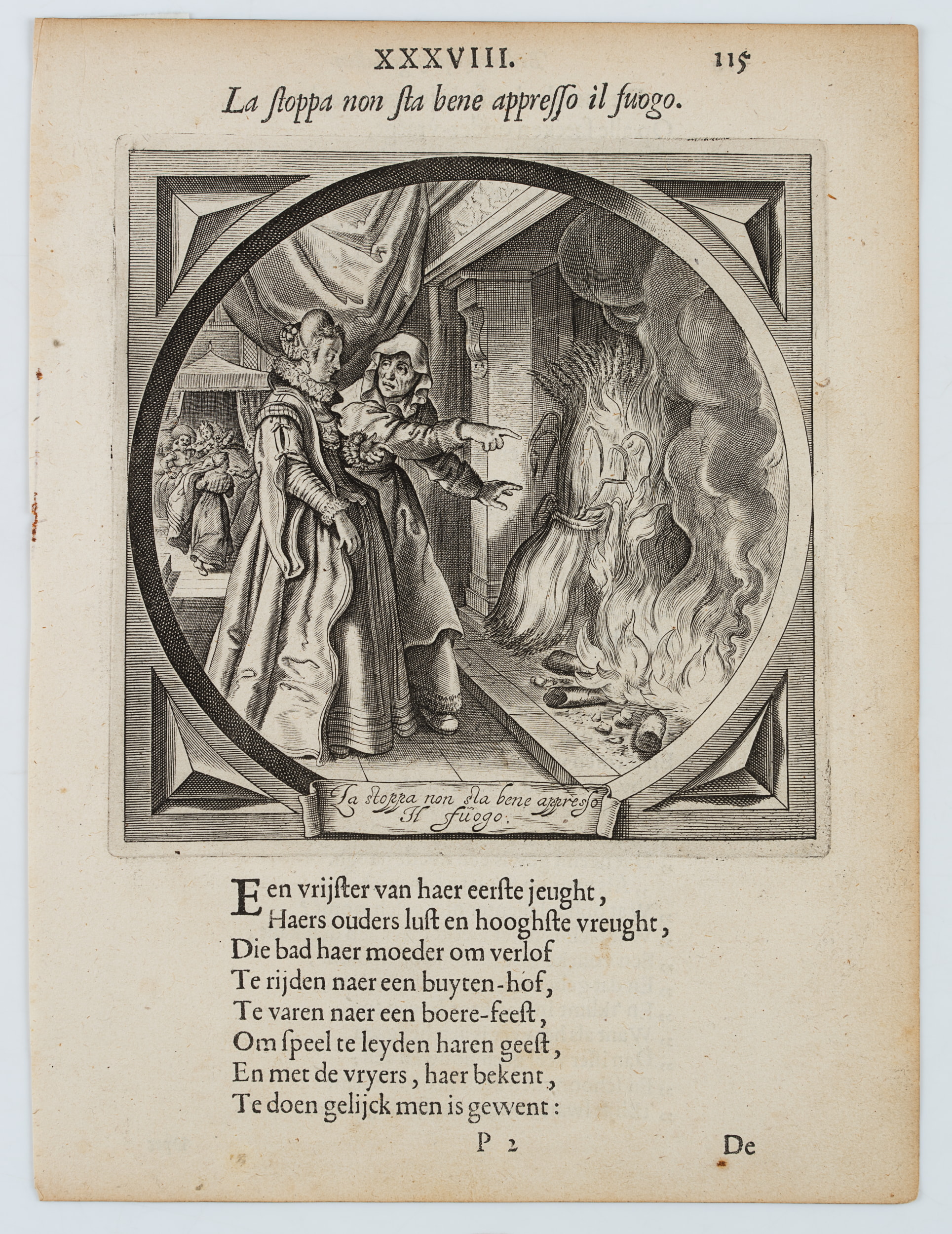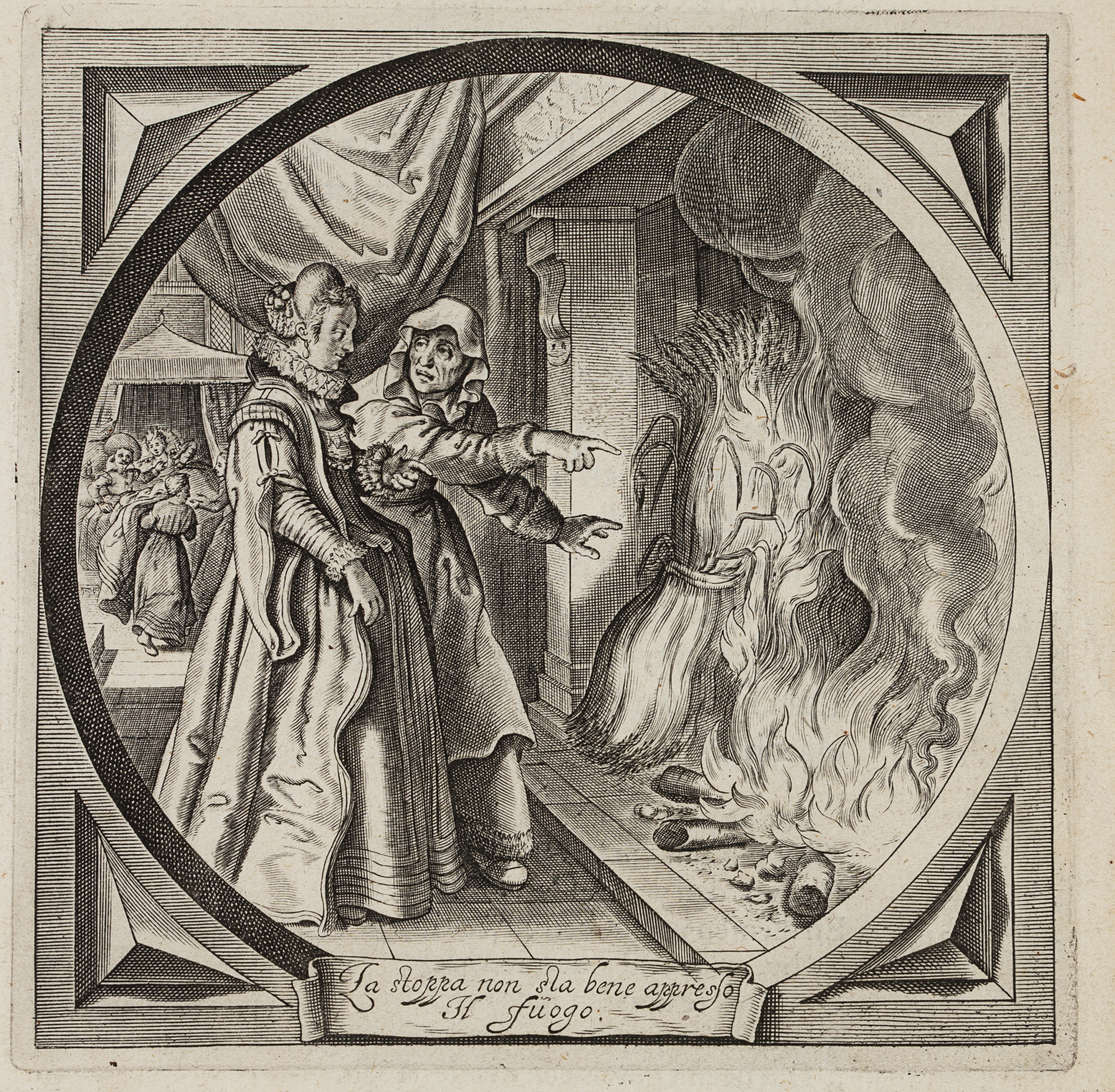 - Inscription: Lower middle inscribed in the printing plate: “La stoppa non sta bene apppresso / Il fuogo.”.