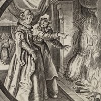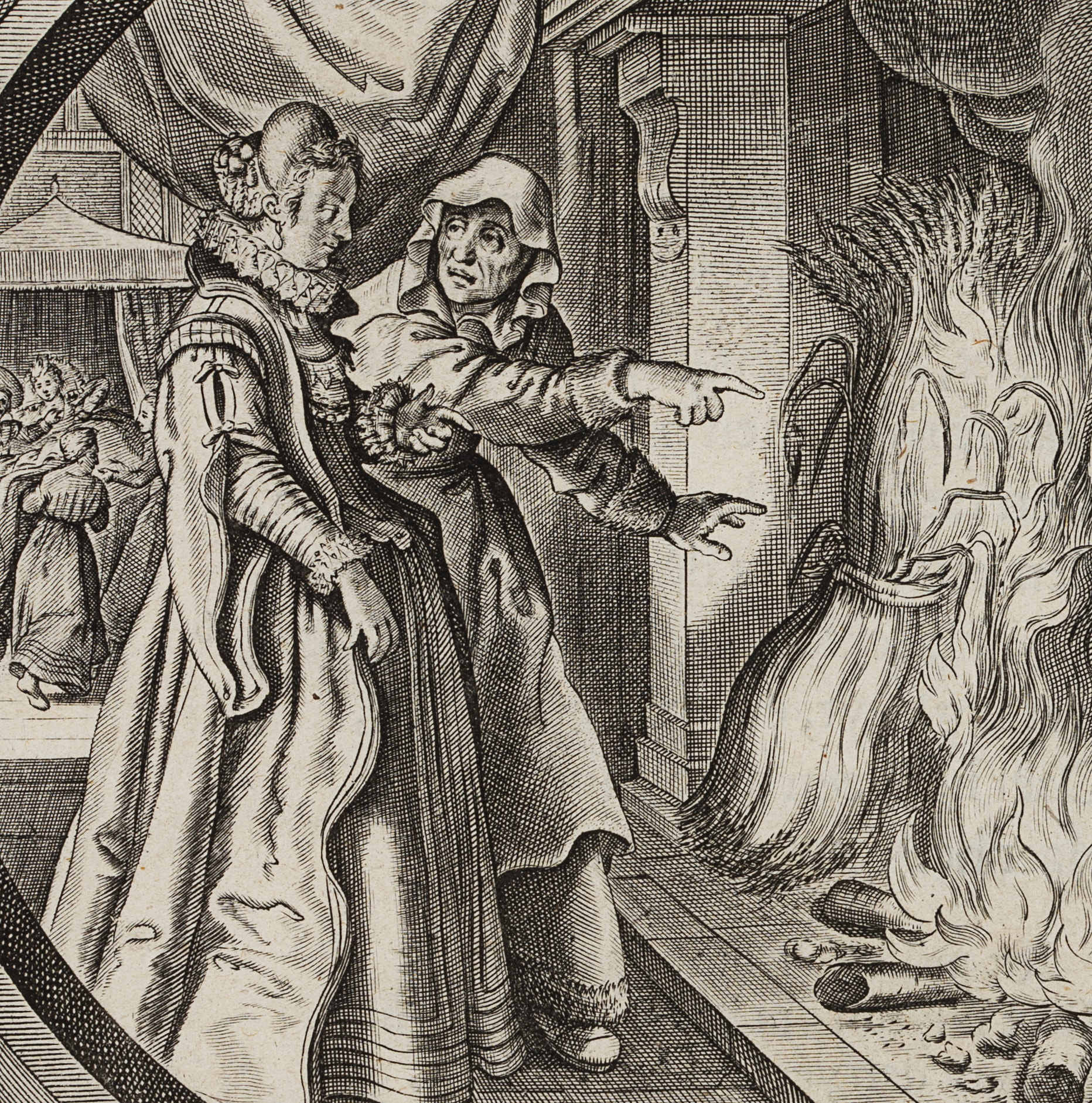 - Description: A young woman and an older woman are standing by a fireplace looking at burning straw. The older woman points at the flames and turns her face towards the younger woman as if explaining something to her. In the background, a woman and a man lie in a bed with a canopy. The foreground is adorned by a kind of faceted stone decoration that provides a circular view of the scene. At the bottom of the picture is a banner.