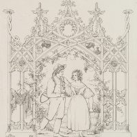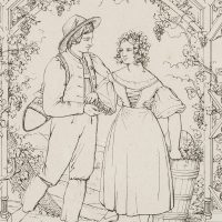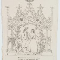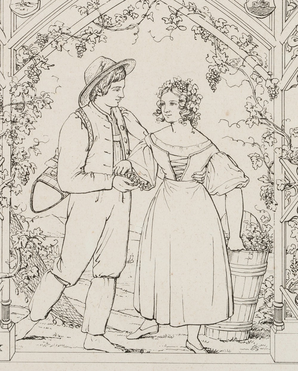 - Beschreibung: Unter einem reich verzierten, an die Spätgotik erinnernden, architektonischen Bogen stehen ein Knabe und ein Mädchen und bedienen sich an Weintrauben.