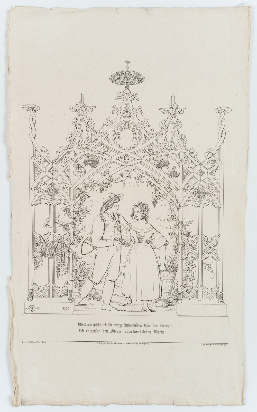 - Inscription: Below, a short verse locates this allegory in the wine-growing region of the Rhine: “Far around I spill the eternally astonishing banks of the realms, I drain the stream, vaterlaendischen Rhein”.