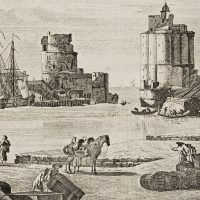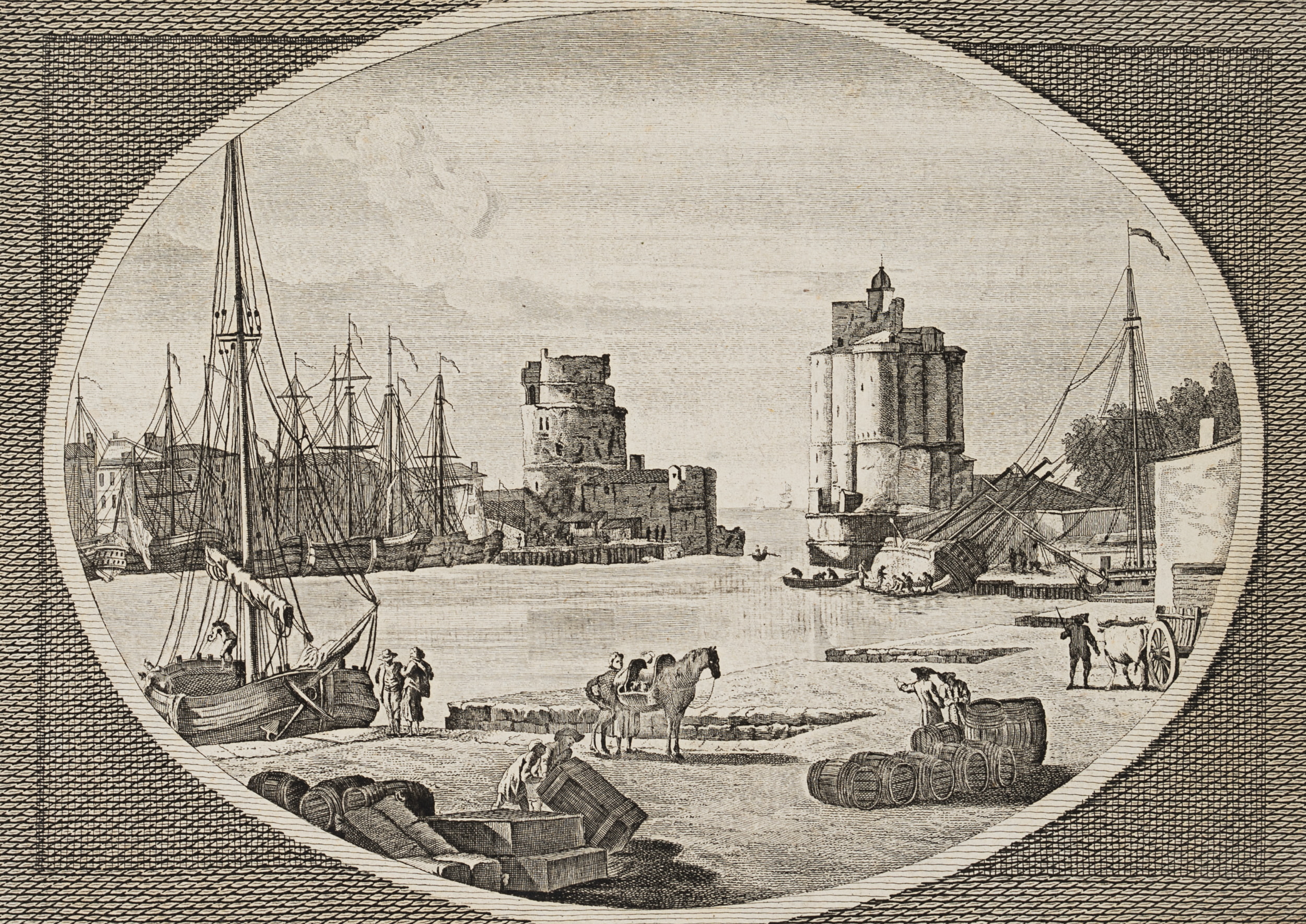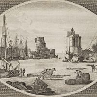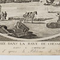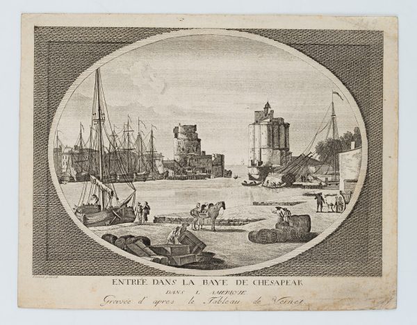 - Description: Imagined view of Chesapeake Bay with many galleons. Soldiers stand at the harbour along with barrels and crates. Fortifications frame the river entrance in the background. The engraving is based on a drawing by Claude Joseph Vernet, who is especially known for his seascapes and harbour views. Vernet drew several views of American port cities during the Revolutionary War, but never travelled to the continent.
