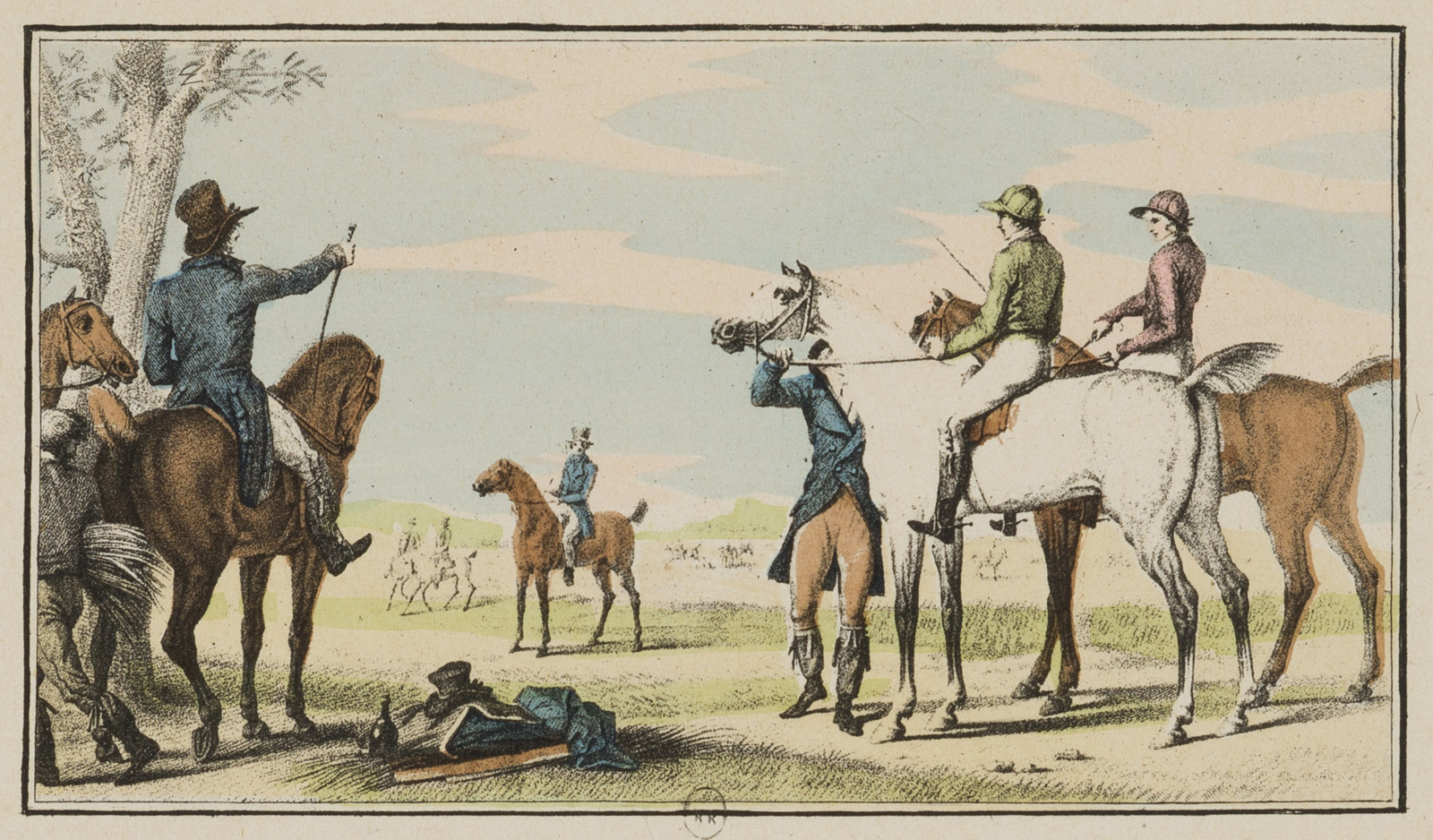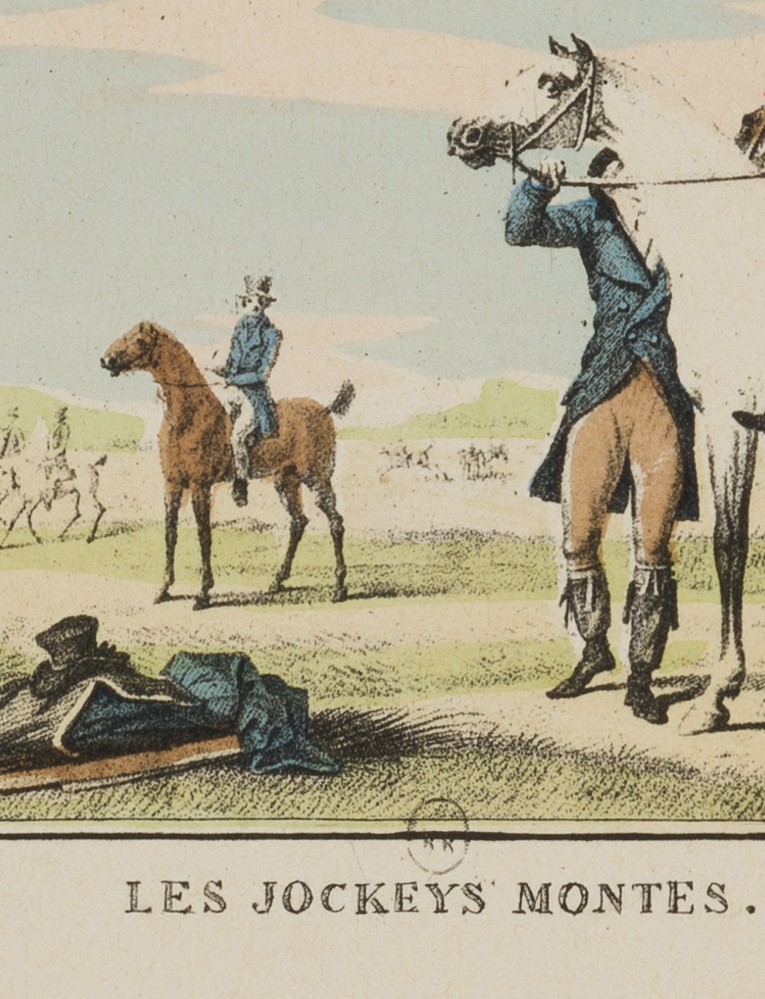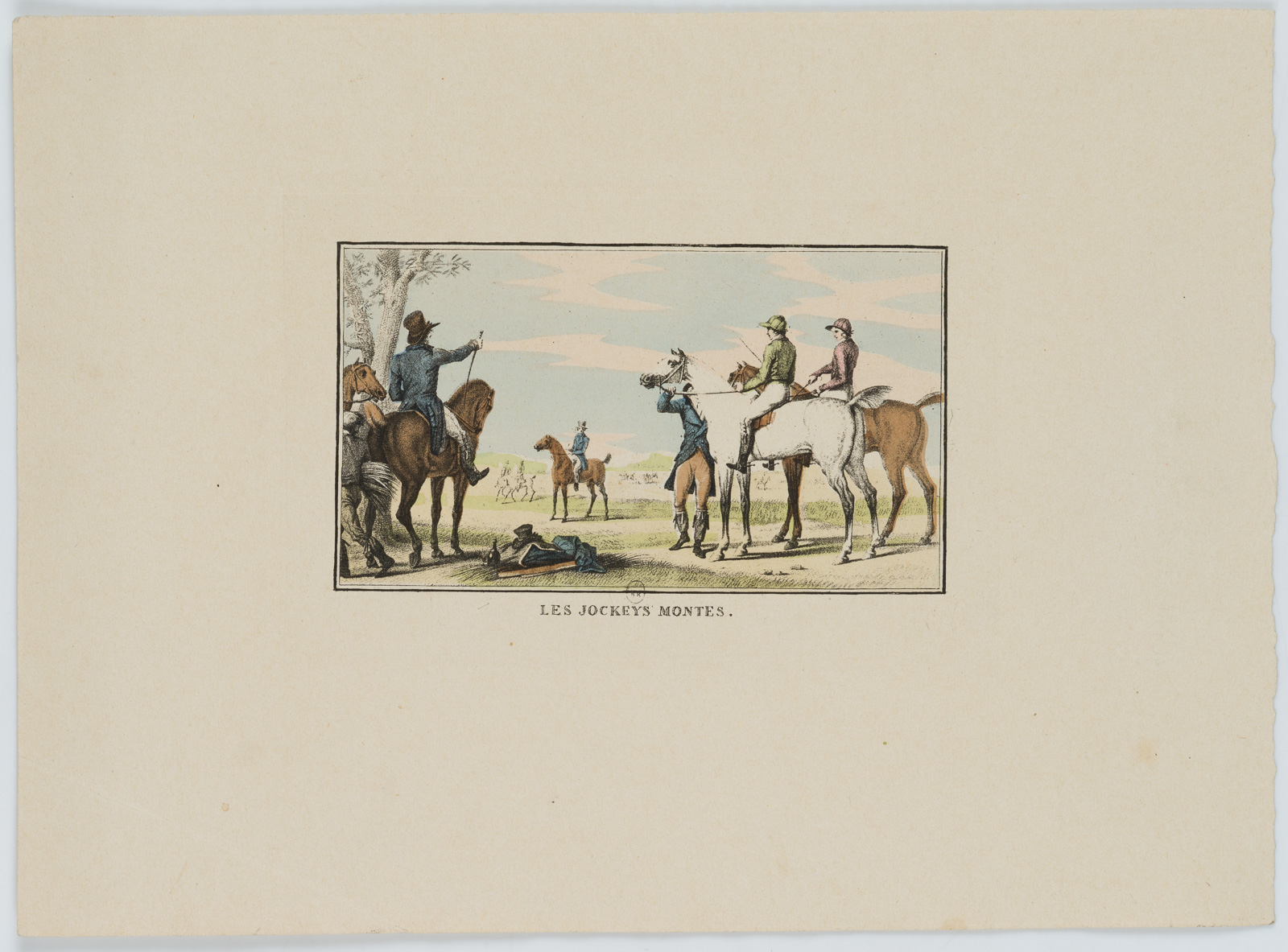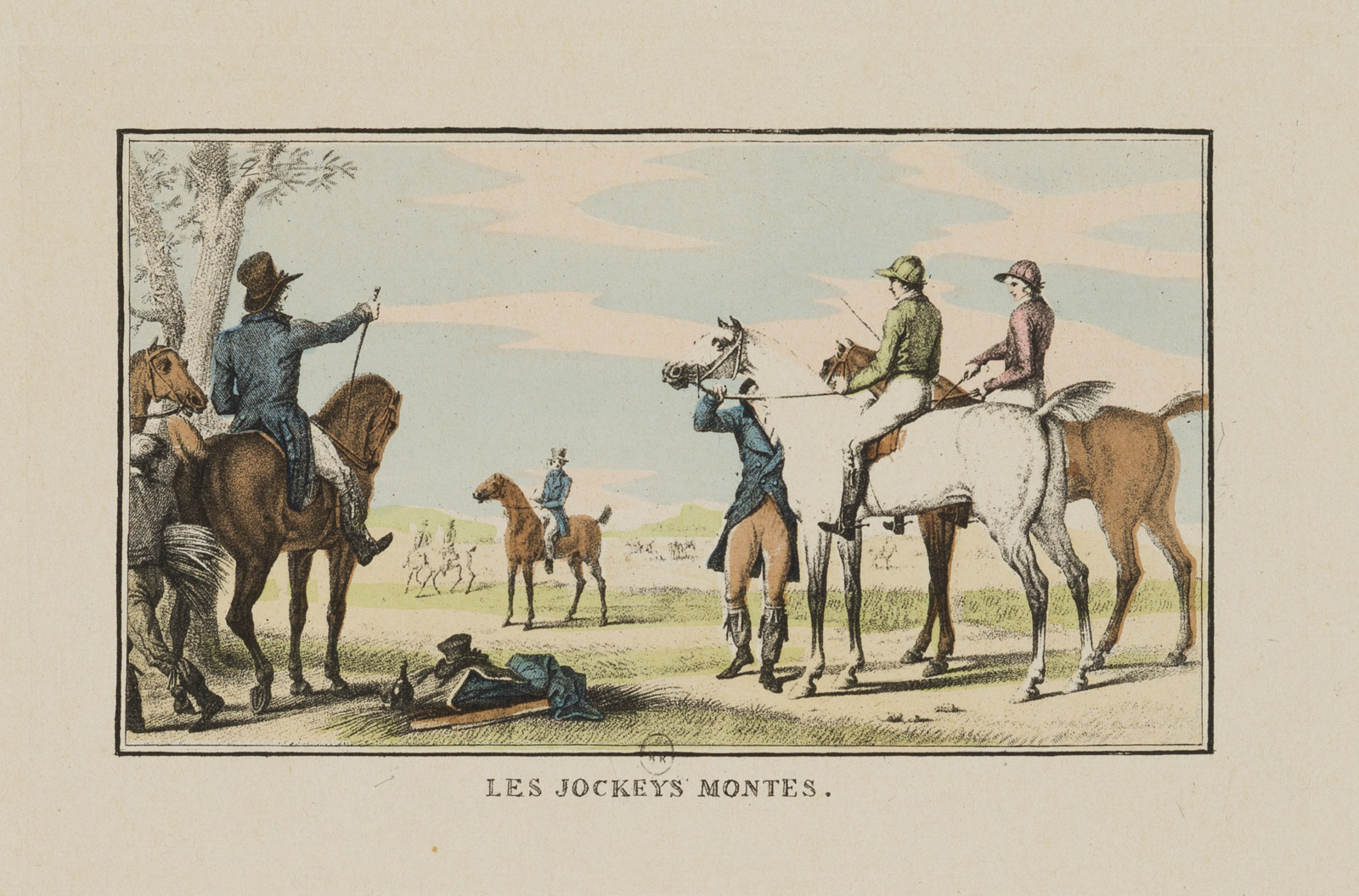 After Horace Emile Jean Vernet (1789 Paris – 1863 ibid.), Horse racing according to VERNET and Carle (Antoine-Charles-Horace), “Les Jockeys Montes”, The four phases of a racing day, 19th century, Crayon manner