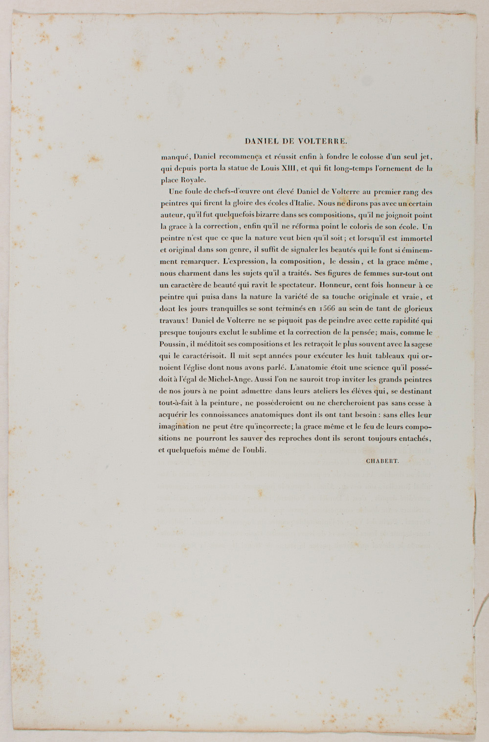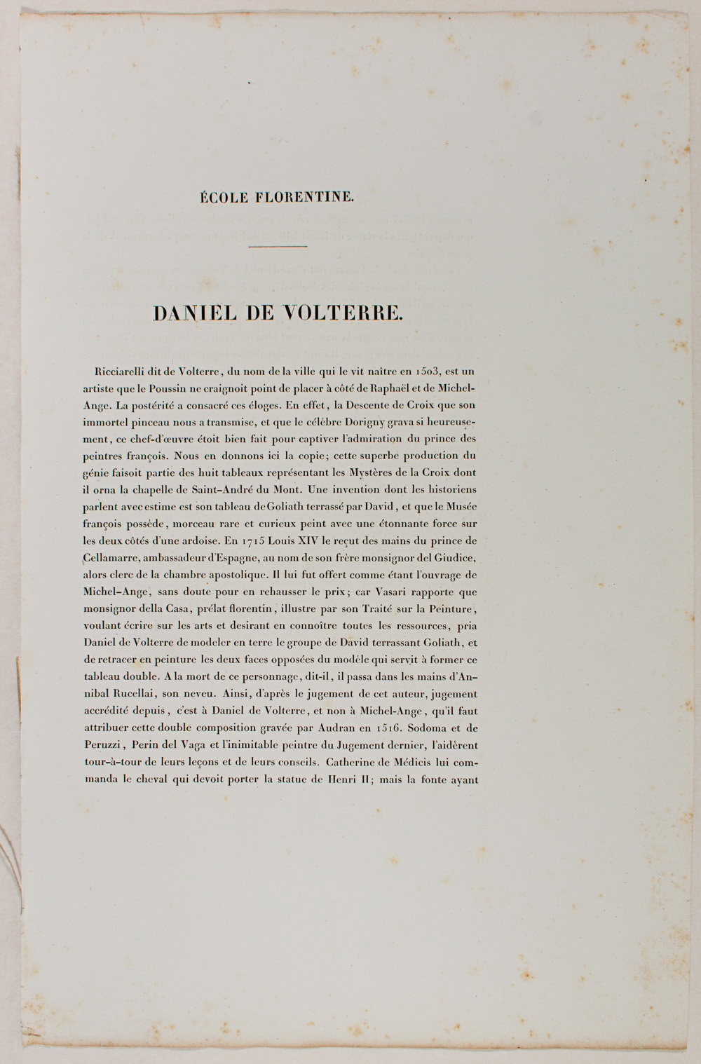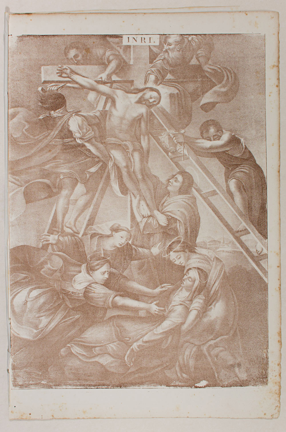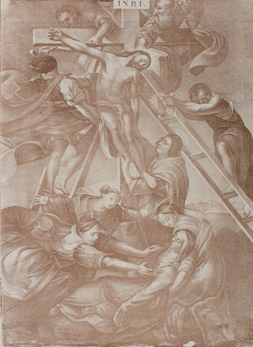 - Description: Crucifixion”, colour lithograph after a work by Daniel de Volterra (1503 -1566) (actually Daniele Ricciarelli). From the series: Pictures of the Romanesque School (Ecole Florentine). Text information (In French by Chabert) in the format of the art sheet.