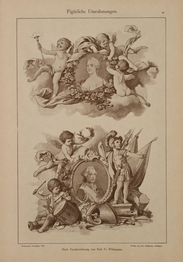 - Description: Decorative original chromolithograph from around the turn of the century.template sheet for draughtsmen, painters, graphic artists, plasterers, decorators, sculptors and architects. No. 52, from: Dekorative Vorbilder: farbige Meisterwerke aus alter und neuer Zeit, published by Julius Hoffmann Stuttgart 1890-1928. Inscribed at the lower margin: “Dekorative Vorbilder VIII. / Nach Tuschzeichnung von Prof. Fr. Widnmann. / Verlag von Jul. Hoffmann, Stuttgart.