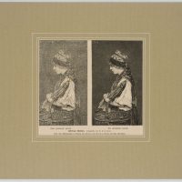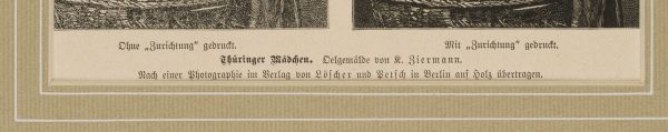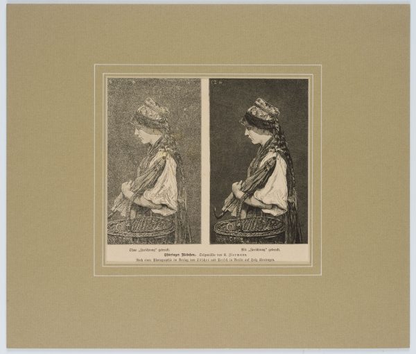 Nach Carl Ziermann (1850 Saalfeld an der Saale – 1881 Bad Berka), Kunst der Bearbeitung eines Holzstiches, Brustporträt im Profil eines thüringischen Mädchens, vor und nach der Feinbearbeitung, 1880, Holzstich